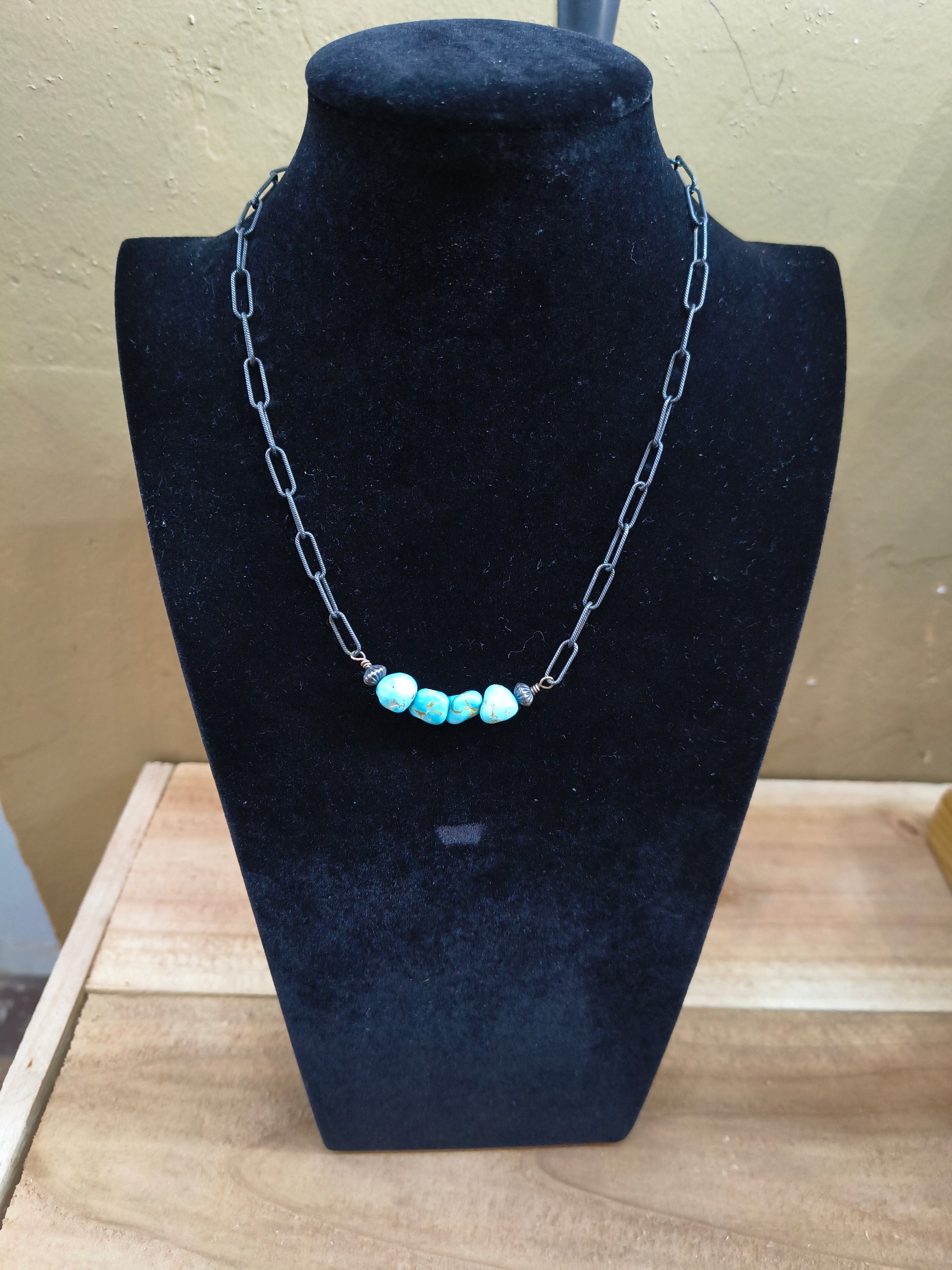 This is the perfect necklace to add to your collection! It features natural turquoise nuggets of the prettiest blue turquoise with a light amount of brown matrix. The turquoise is on a textured, dark silver 16" paperclip chain and has two silver saucer beads on either side of the turquoise.