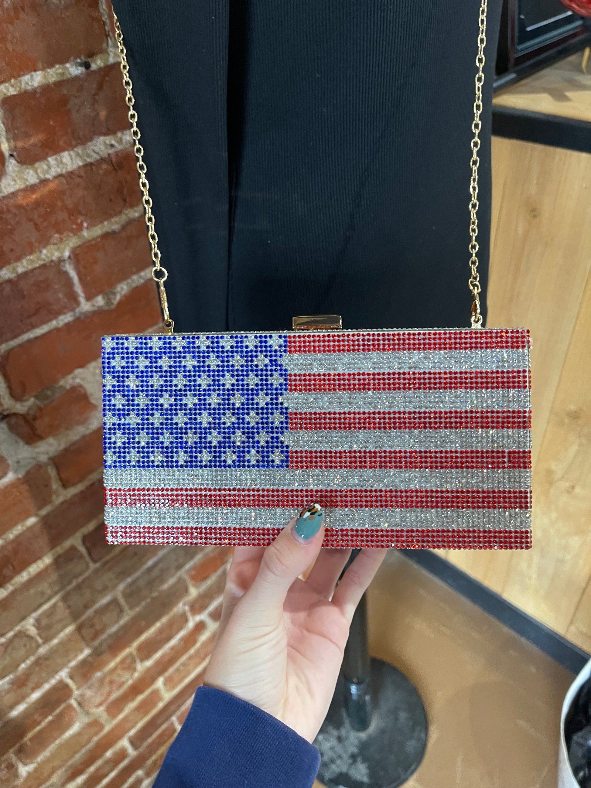 Add a patriotic sparkle to your style with this Bedazzled American Flag Purse. Designed to catch eyes, it combines classic Americana with dazzling embellishments for a bold, fashion-forward statement. Perfect for everyday use or special occasions, this purse offers both flair and functionality, letting you carry essentials with pride and elegance wherever you go.