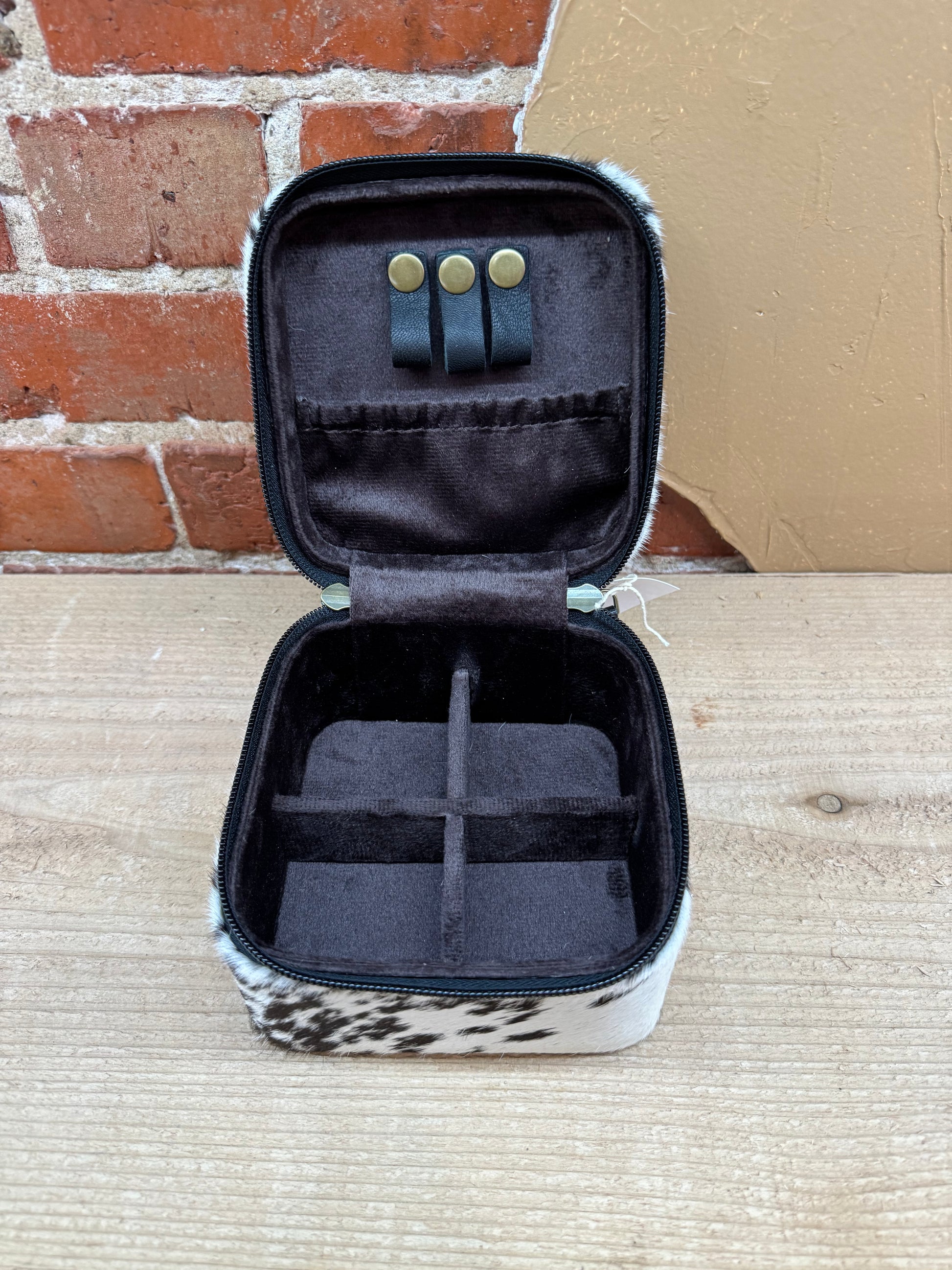 This Black and Red Checkered Painted Leather and Cowhide Small Jewelry Box features a compact design measuring 5" long, 5" wide, and 3.5" tall. Its felt-lined interior gently protects your jewelry, while the black stitching adds a sophisticated contrast. A stylish and practical choice for keeping your treasured pieces secure and easily accessible. Hide may vary slightly.