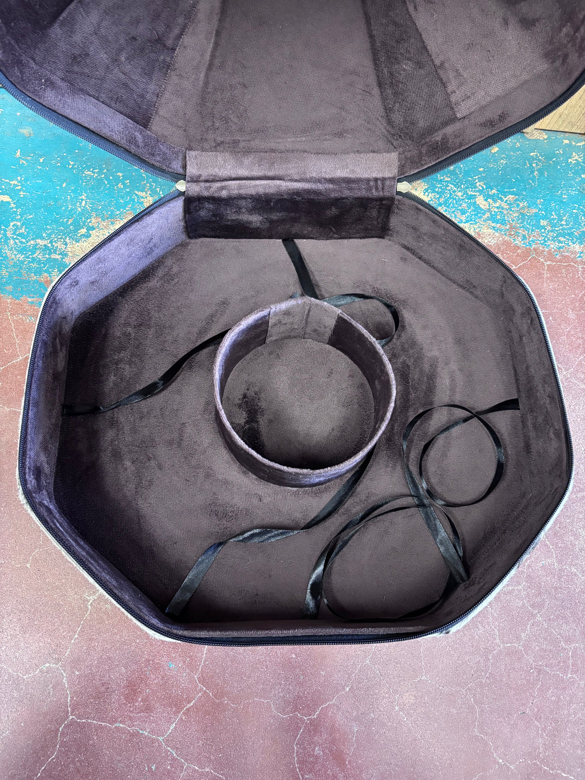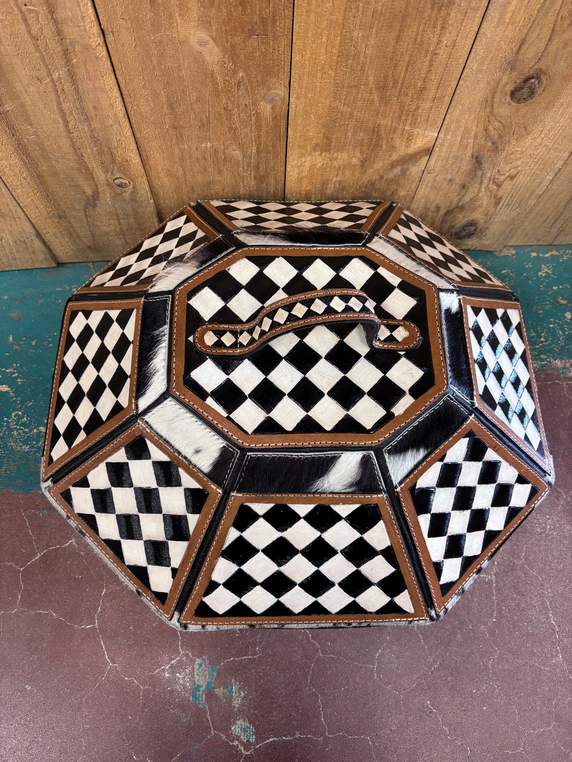 Black and White Checkered Cowhide Cowboy Hat Box This striking octagonal storage piece combines authentic Western style with practical elegance. Standing 12 inches tall and 20 inches wide, it features genuine black and white cowhide with bold checkered patterns and rich brown leather trim. The checkered design extends across the top and handle for cohesive visual appeal, while the sumptuous dark brown velvet interior—secured with black tie strings protecting your most treasured hats and keepsakes. Perfect for collectors and Western enthusiasts who refuse to compromise on craftsmanship or aesthetics.