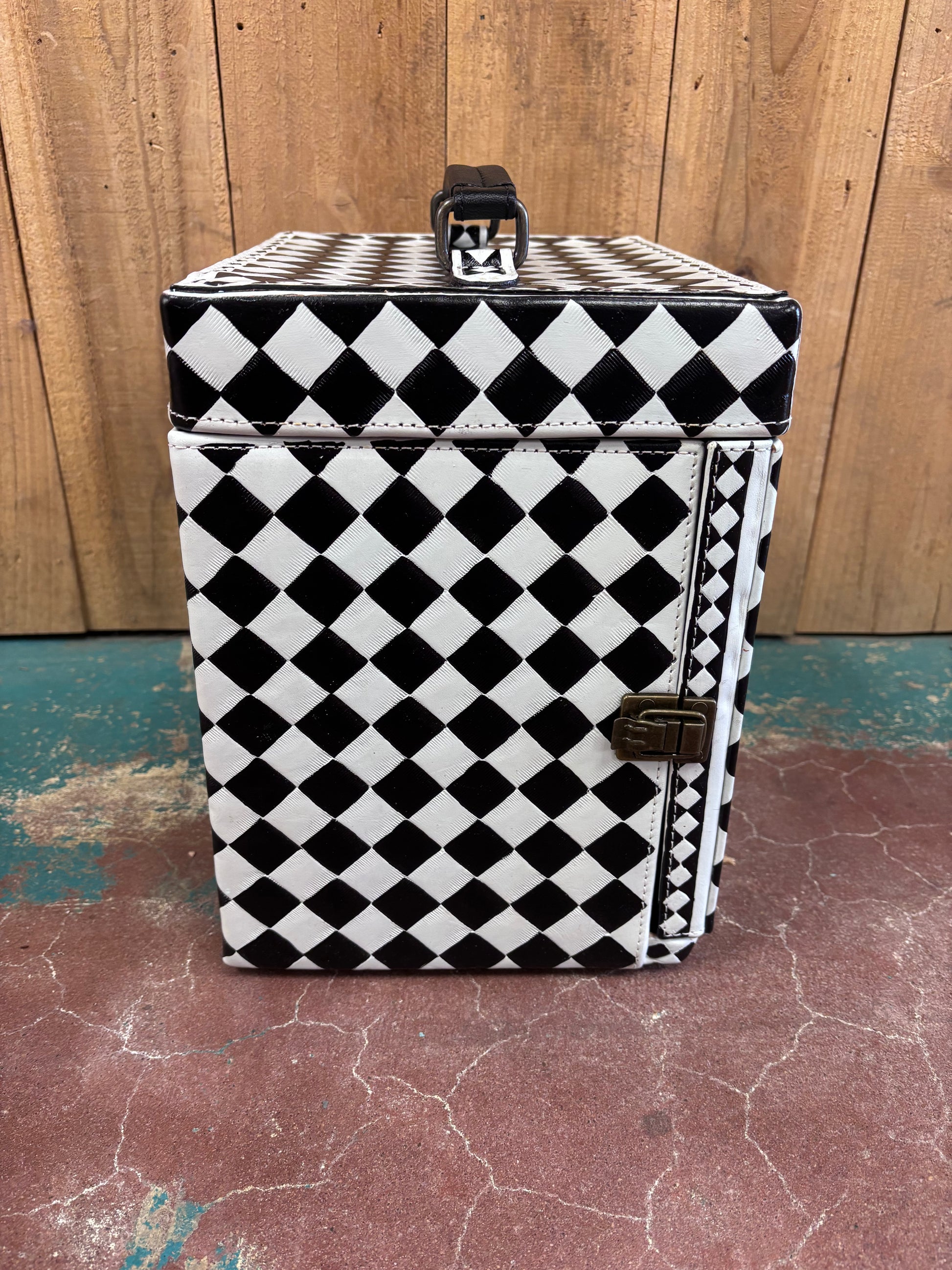 Keep your essentials organized and protected with this Black and White Checkered Train Case. Standing 11.5 inches tall and 11 inches wide, it features durable buck stitching at the top and three secure clasp locks to keep your items safe. Multiple storage compartments provide flexible organization for cosmetics, jewelry, or travel necessities. Includes a convenient 2x5 inch checkered storage case for additional organization on the go. Perfect for anyone who values both style and functionality.