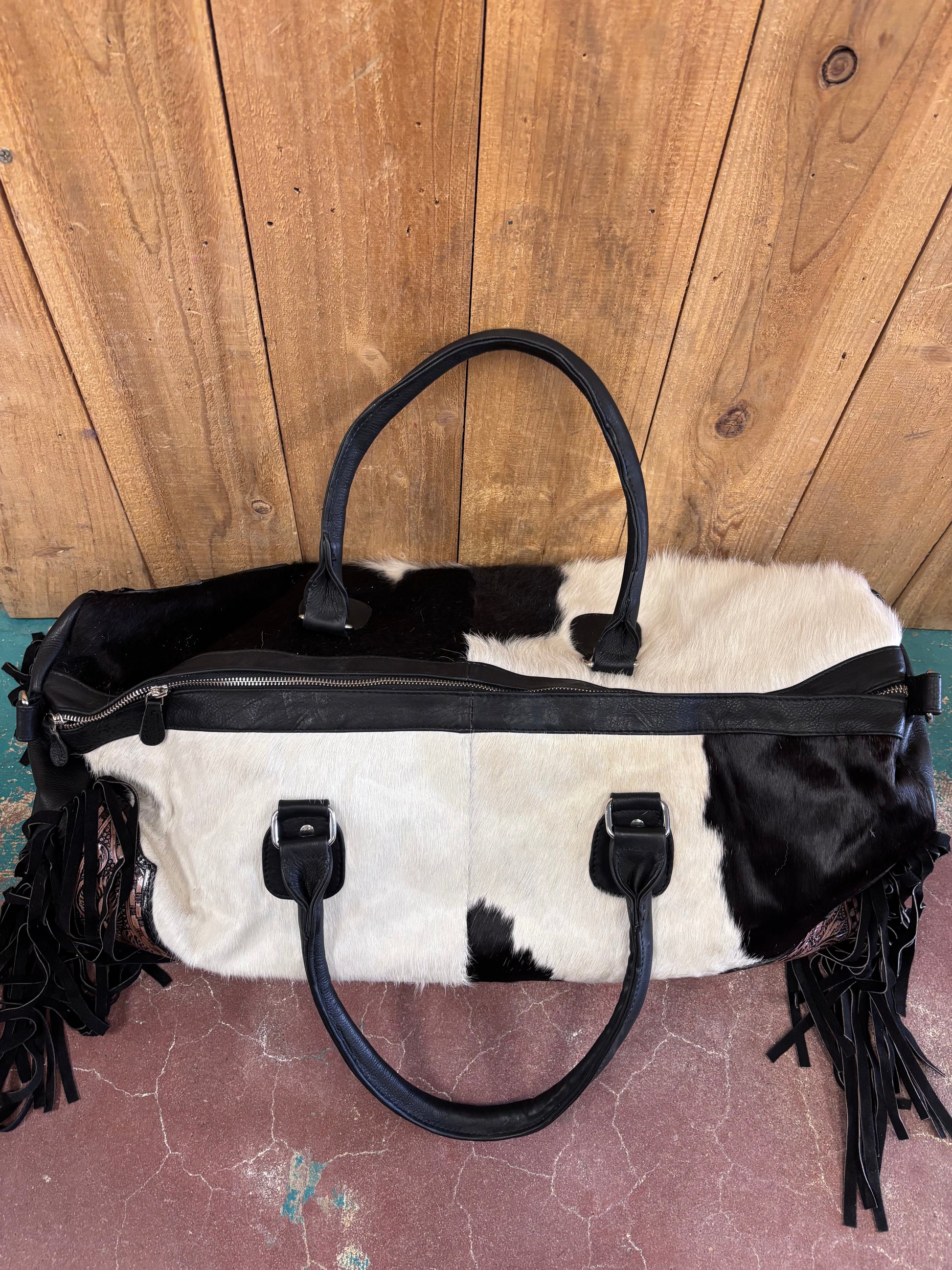 This striking duffle bag combines rustic charm with practical style. Crafted from genuine black and white cowhide with intricate leather tooling adorning each side, it makes a bold statement wherever you go. Dramatic black leather fringe cascades down both sides, adding movement and Western flair. Measuring 21 inches long by 19 inches wide, it offers ample capacity for weekend getaways or everyday adventures. Inside, three convenient pockets keep your essentials organized and within reach. Perfect for those who refuse to compromise on character or functionality. * Cowhide may vary*