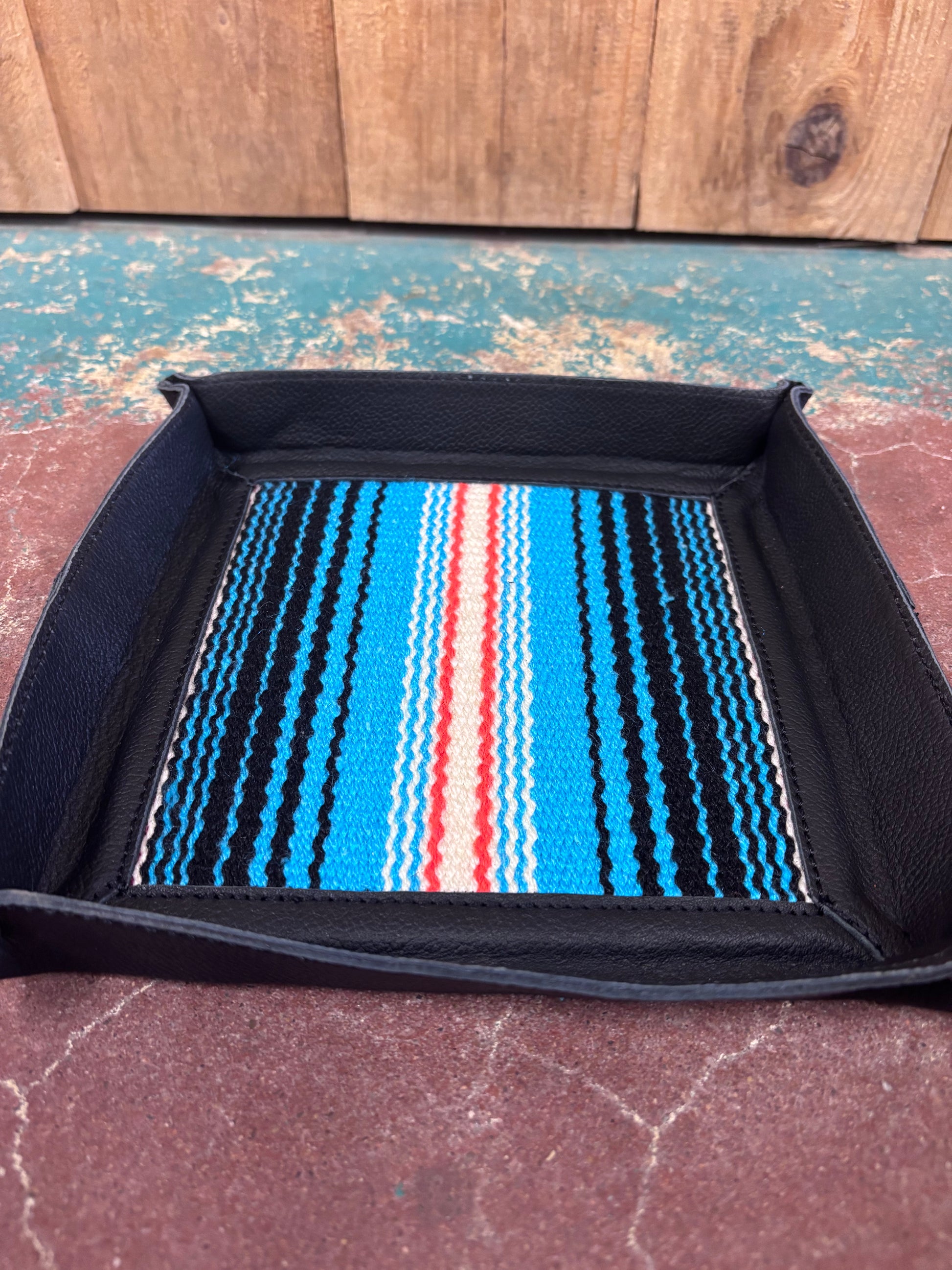 Display your finest pieces with this handcrafted leather jewelry tray. This handcrafted jewelry tray brings Western artistry to your space with striking detail. This 9-inch square jewelry tray features a rich black leather base accented by a striking geometric inlay in white, blue, black, and orange. Perfect for organizing rings, bracelets, and pendants on a dresser, nightstand, or retail counter. The durable leather construction and bold color palette complement both contemporary and Southwestern décor, making it an ideal choice for collectors and gift-givers alike.