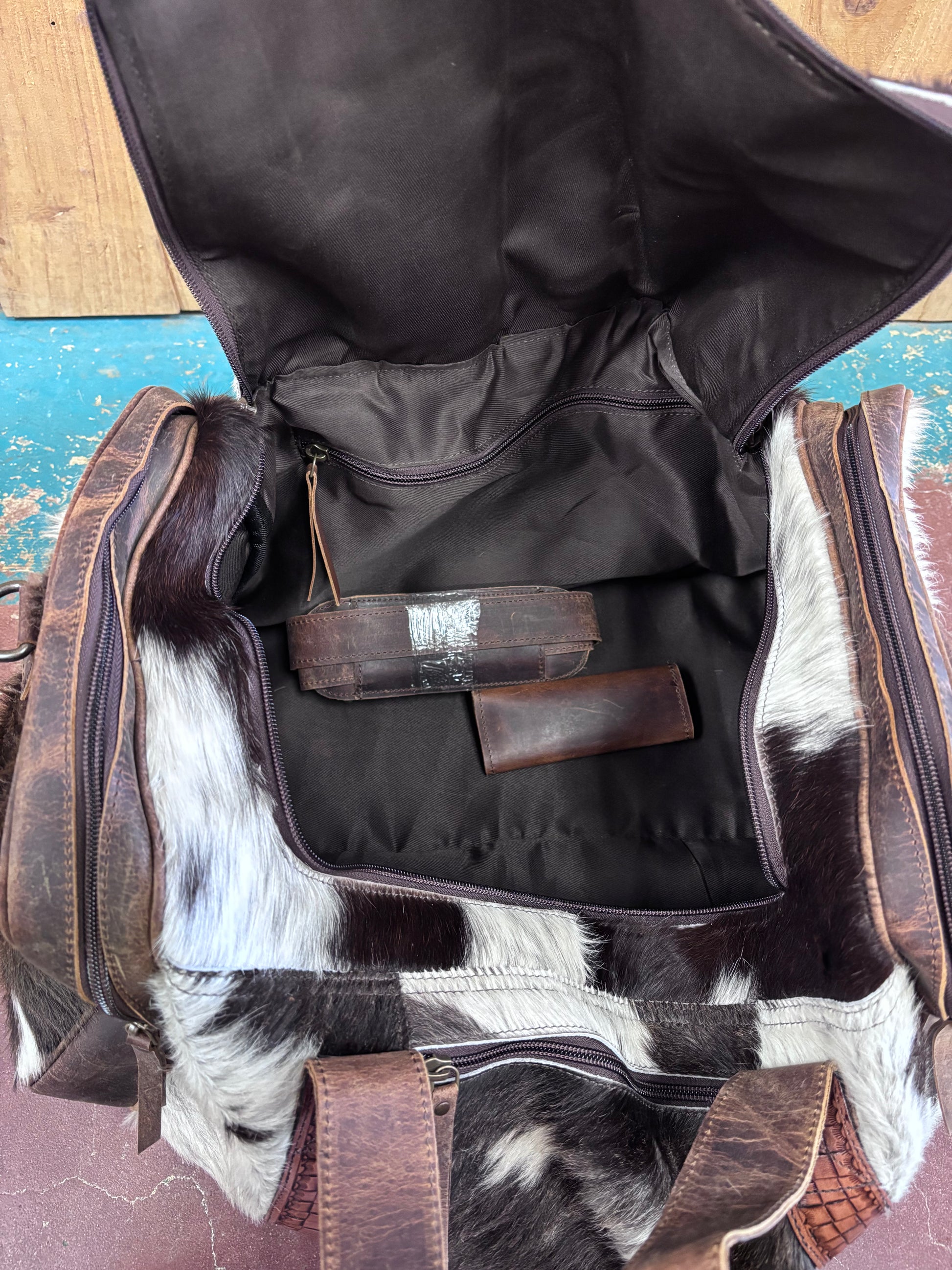 Brown And White Cowhide Duffle Bag