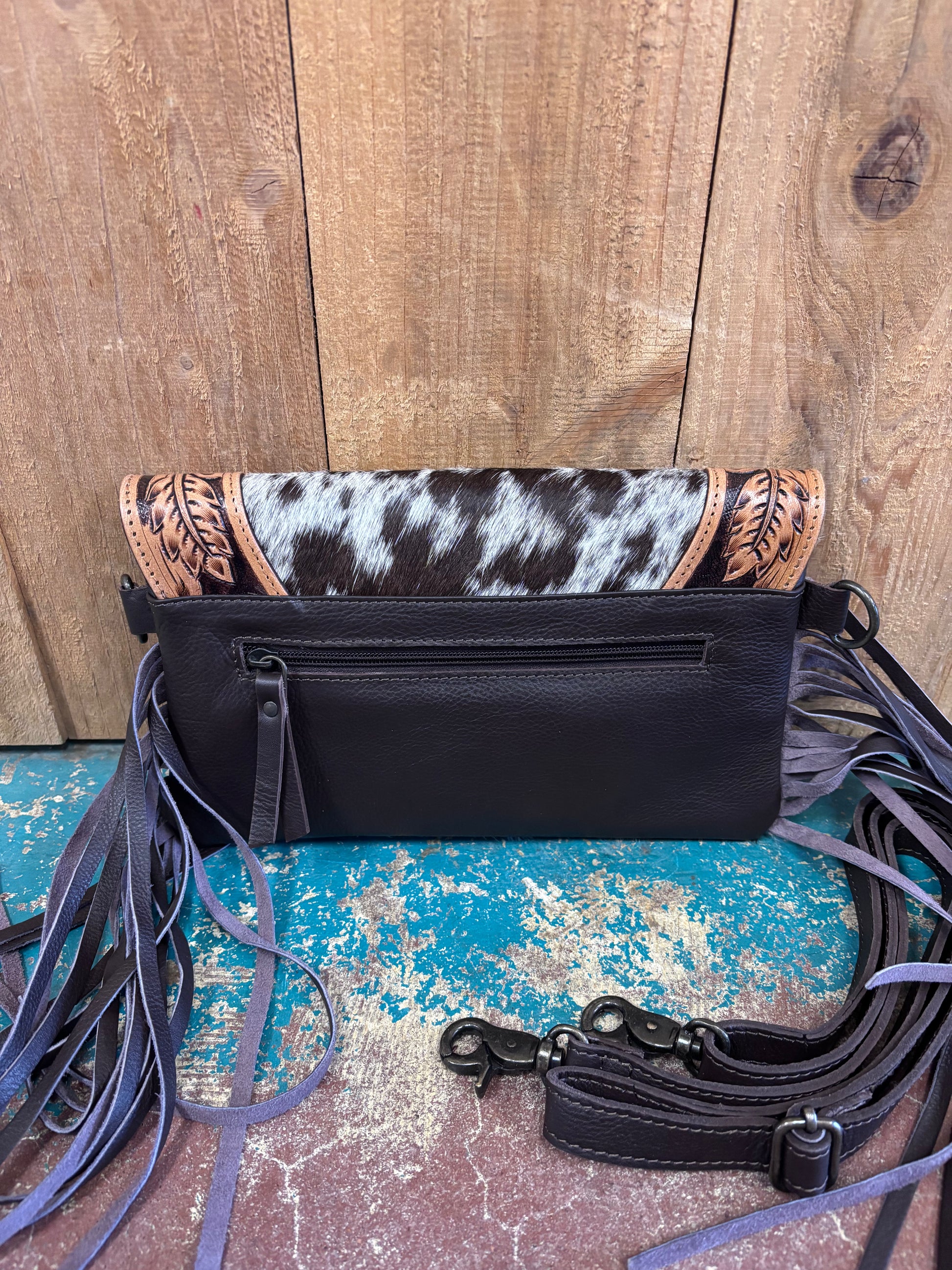 Carry Western elegance with this handcrafted brown and white cowhide purse, standing 6.5 inches tall and 10 inches wide. Tan flower tooling adorns the flap edge, while rich brown fringe cascades down the sides for authentic frontier flair. A secure magnetic button keeps your essentials safe, while practical storage includes a rear zipper pocket, interior zippered compartment, and side pocket. The matching leather strap completes this statement piece—perfect for anyone who values artisan craftsmanship and timeless style. *Cowhide may vary*