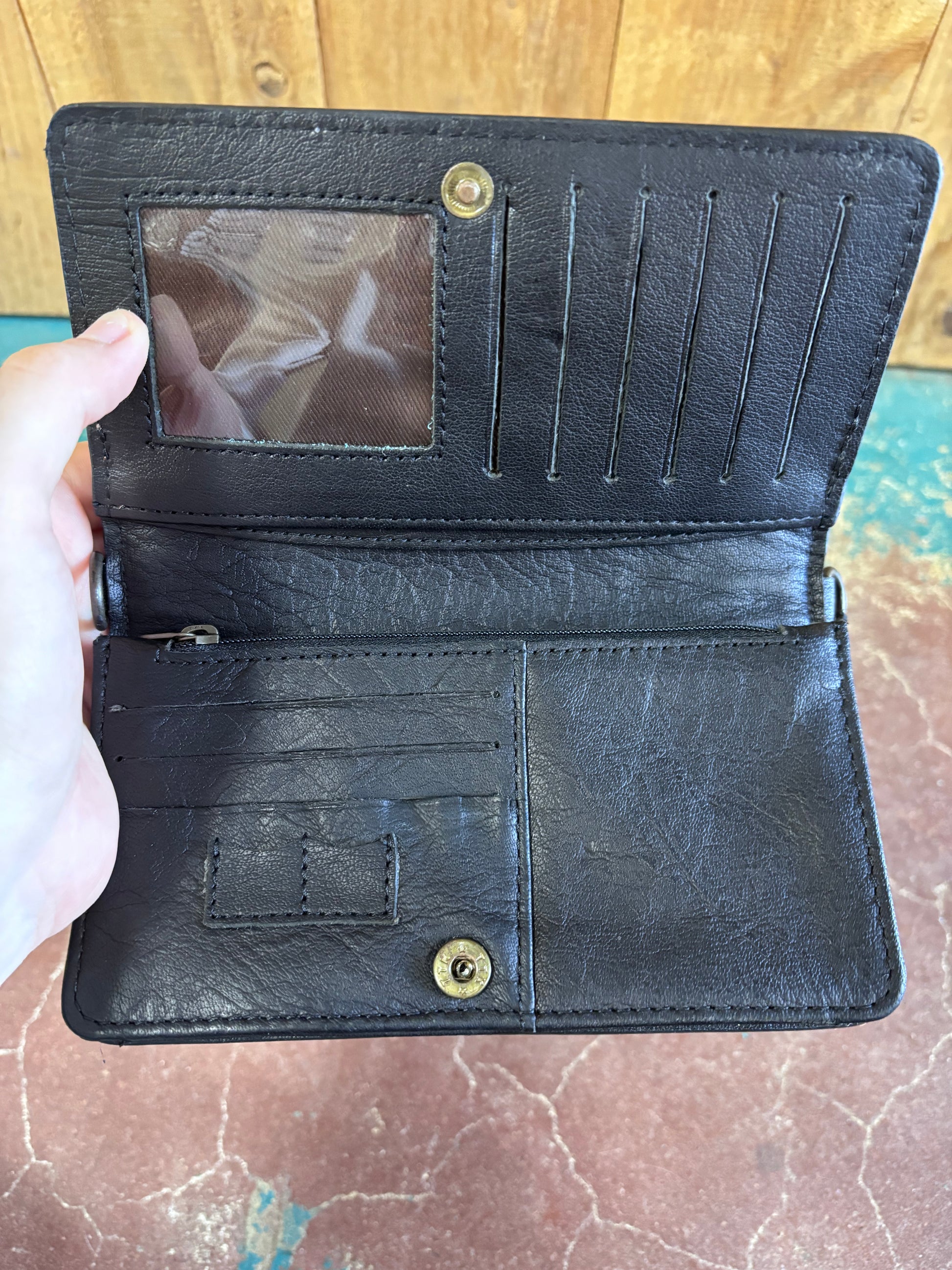 Handcrafted from rich white cowhide, this striking wallet combines rustic charm with functional elegance. Delicate flower tooling adorns the front and back, while authentic buck stitching frames the edges for durability. A silver decorative piece crowned with an embedded turquoise stone serves as the focal point, secured by a sturdy button closure. Inside, discover dedicated slots for cards and cash, keeping essentials organized and accessible. The included bag strap transforms this piece into a versatile crossbody accessory, perfect for those who appreciate artisanal craftsmanship and Southwestern heritage in their everyday carry. *Cowhide may vary*