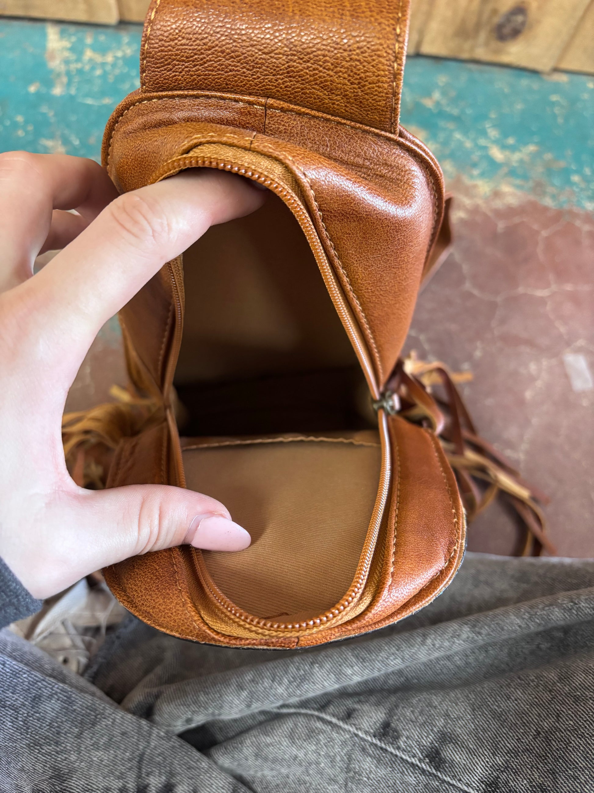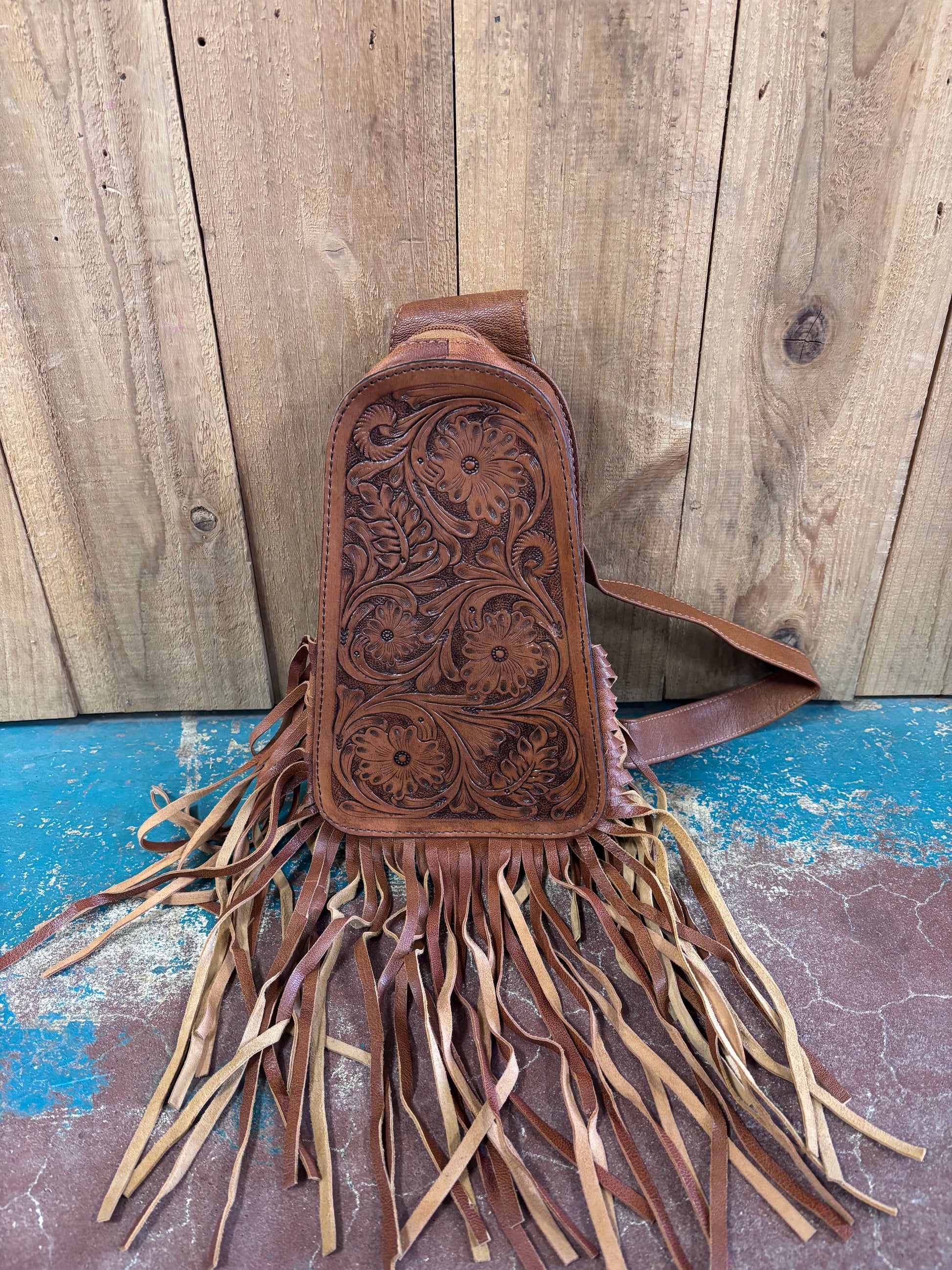 Brown Leather Flower Tooled Fringe Sling Bag/Purse