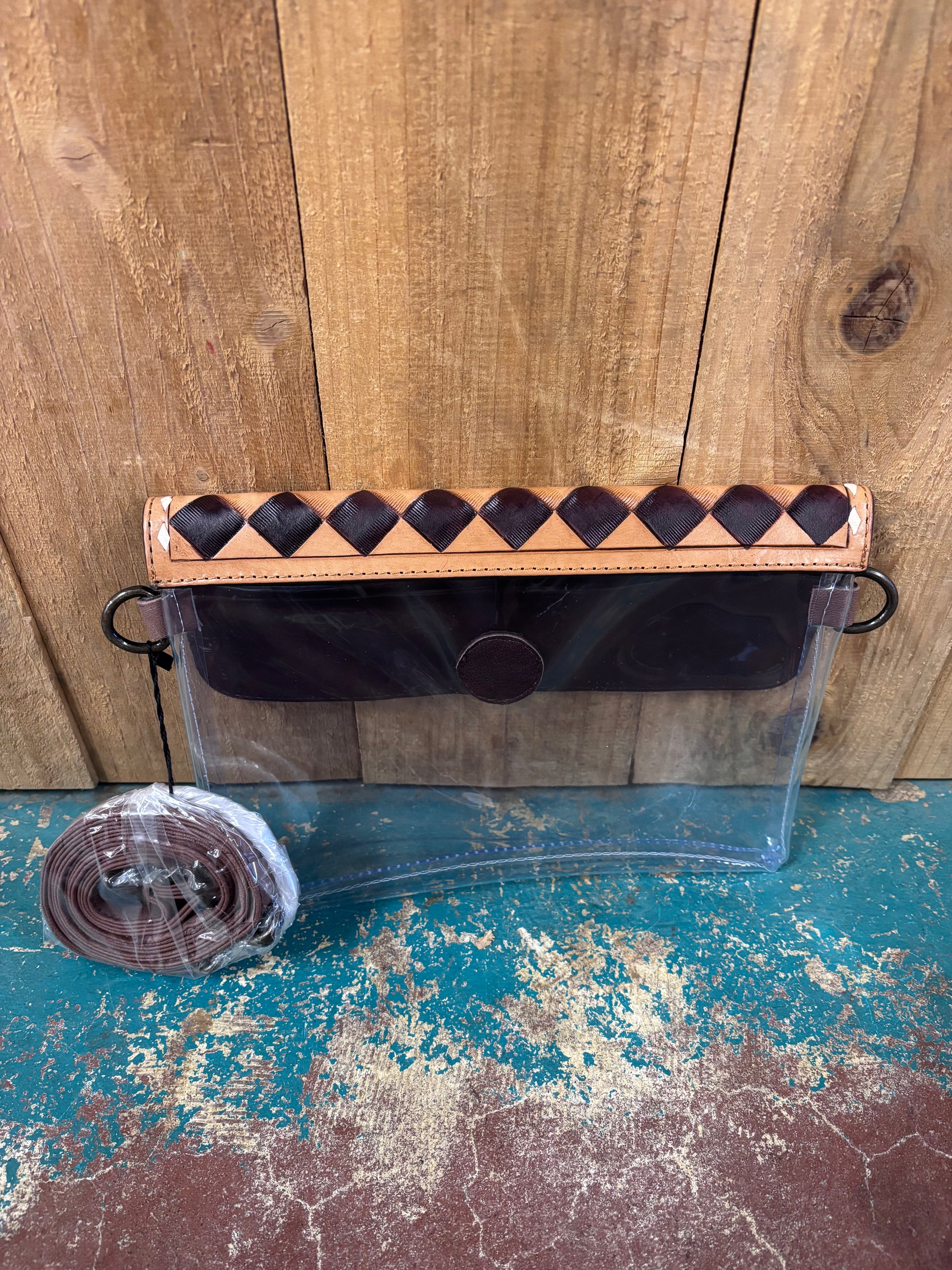 Clear Checkered Tooled Leather Purse carry your essentials in style with this striking clear leather purse, featuring hand-tooled checkered detailing on the flap with buck stitching around the edge. Measuring 8 inches tall by 11 inches wide, it's the ideal size for phones, cards, and personal items without the bulk. The magnetic button closure keeps everything secure, while the included matching leather bag strap lets you wear it crossbody or over your shoulder. Perfect for stadium events, NFR rodeos, or any occasion where you want to showcase what's inside while making a statement. Handcrafted quality meets everyday practicality.