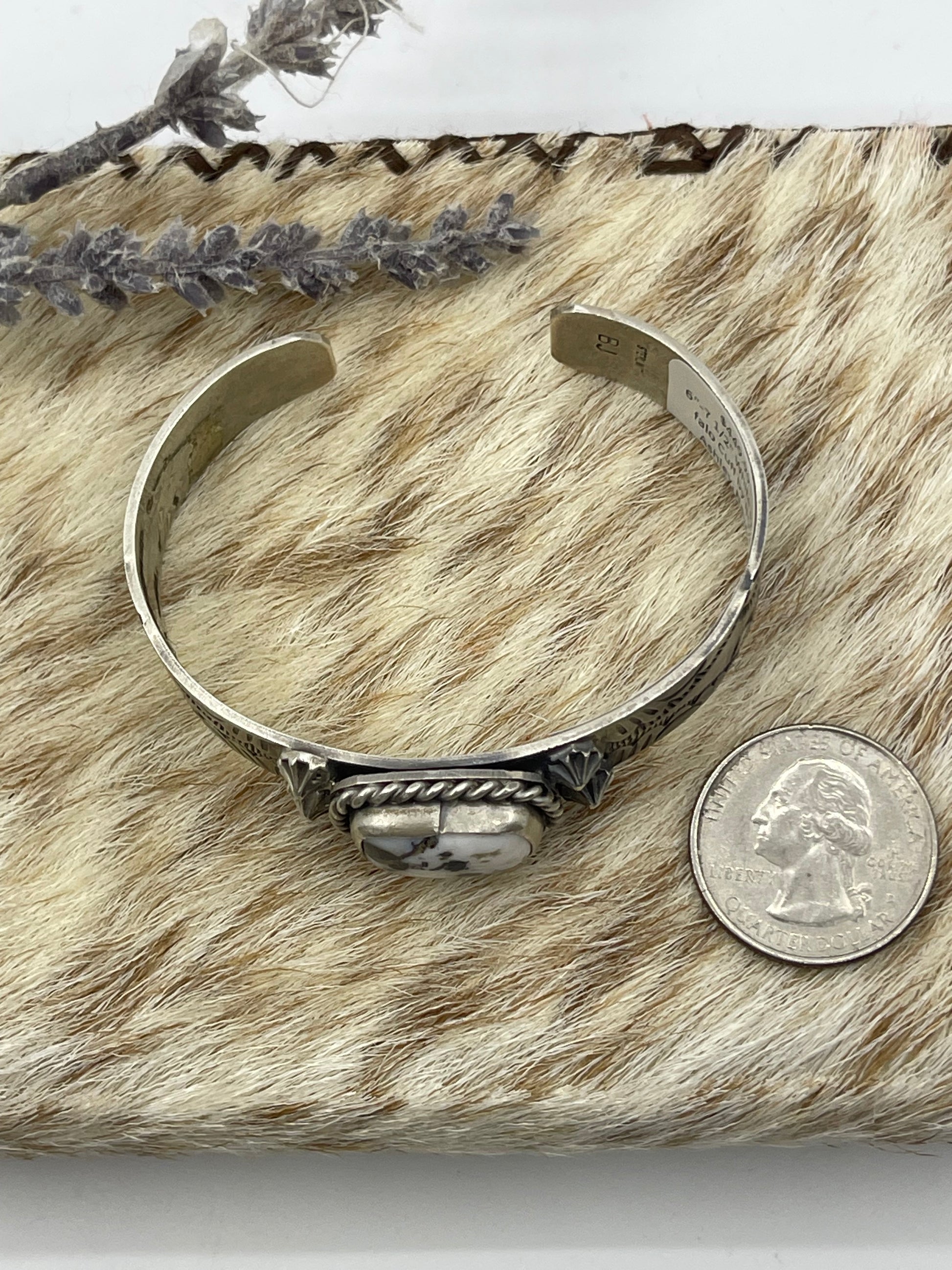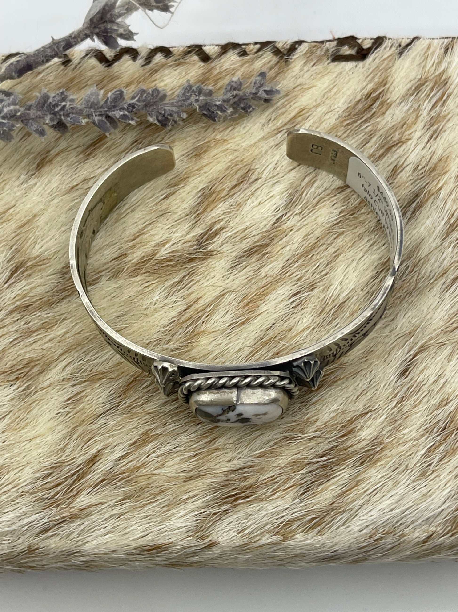 This exquisite 6"-7 1/2" White Buffalo Cuff by Navajo artist Boyd Ashley showcases authentic craftsmanship and timeless style. Featuring striking white buffalo stones set in sterling silver, this cuff adds a bold yet elegant touch to any outfit. Its adjustable size ensures a comfortable fit, making it a perfect statement piece for those who appreciate genuine Native American artistry and unique jewelry. Elevate your collection with this distinctive cuff that blends tradition and modern flair.