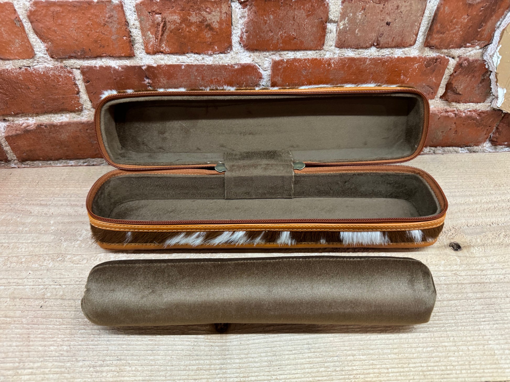 This Cowhide and Brown Leather Border Bracelet Holder doubles as a stylish organizer for small hair tools. Its 14" length, 3" width, and 3.5" height provide an ideal shape to keep essentials tidy. Lined with soft felt, it protects your tools from scratches while adding a touch of sophistication to your space. Perfect for keeping beauty accessories within easy reach.