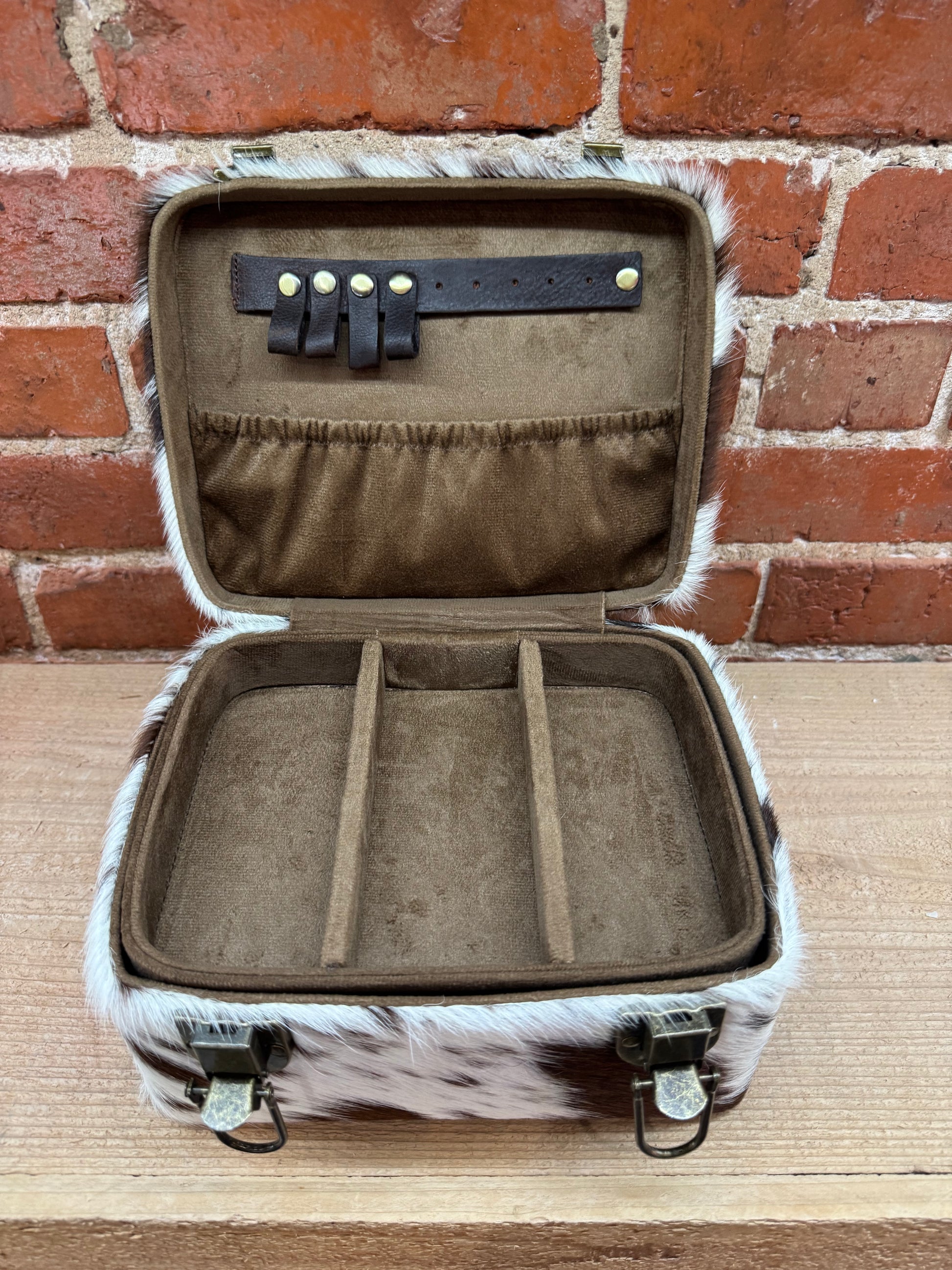 Elevate your jewelry organization with this elegant two-level jewelry box, featuring a luxurious cowhide exterior accented with genuine leather. Inside, a soft felt lining protects your treasured pieces while keeping them neatly arranged. Standing 4.5" tall, 9" long, and 7" wide, it offers ample space without taking up much room. Its thoughtful design combines style and function, making it perfect for safekeeping your favorite accessories or gifting to someone special.