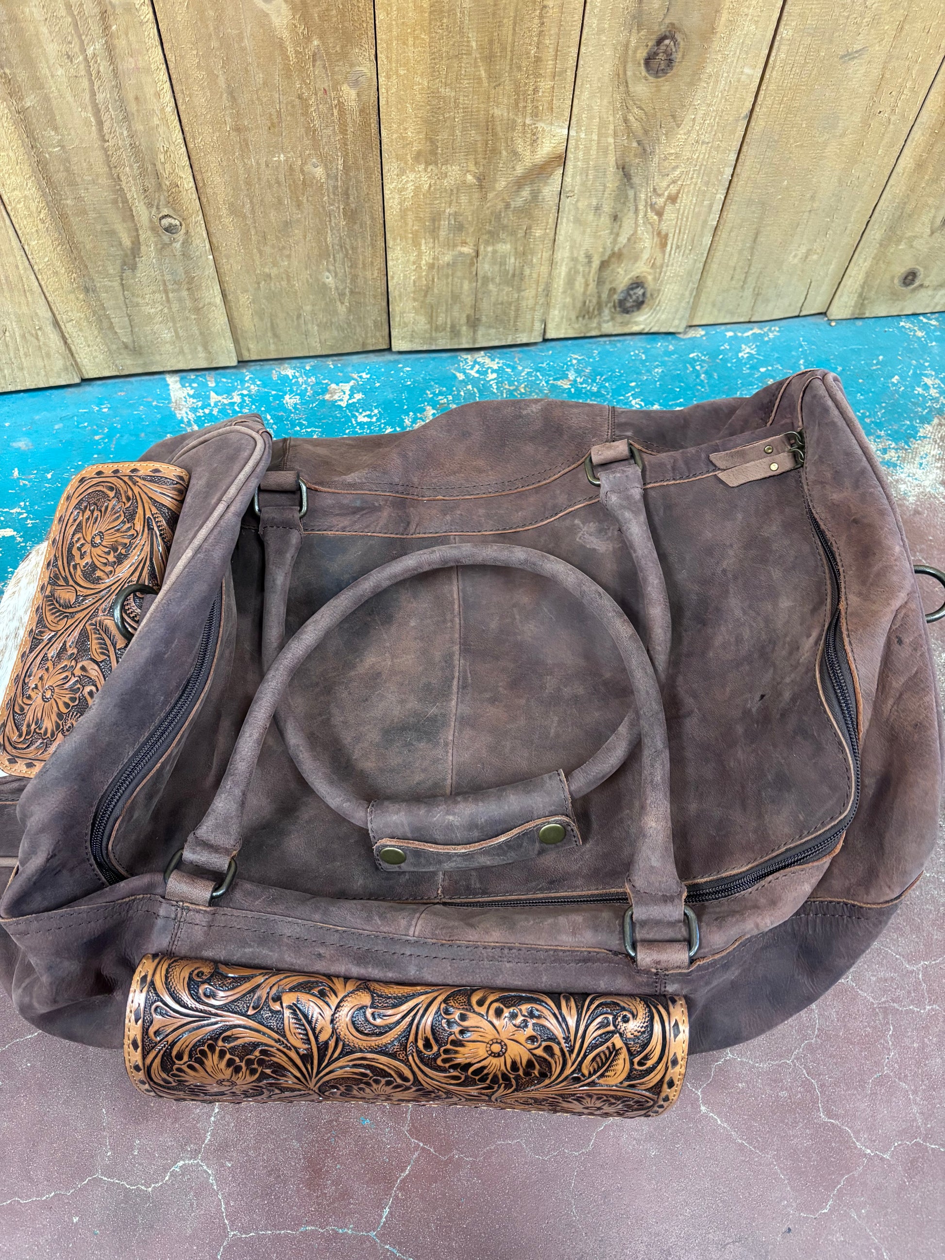 Dark Brown Leather Tooled Cowhide Pocket Duffle Bag