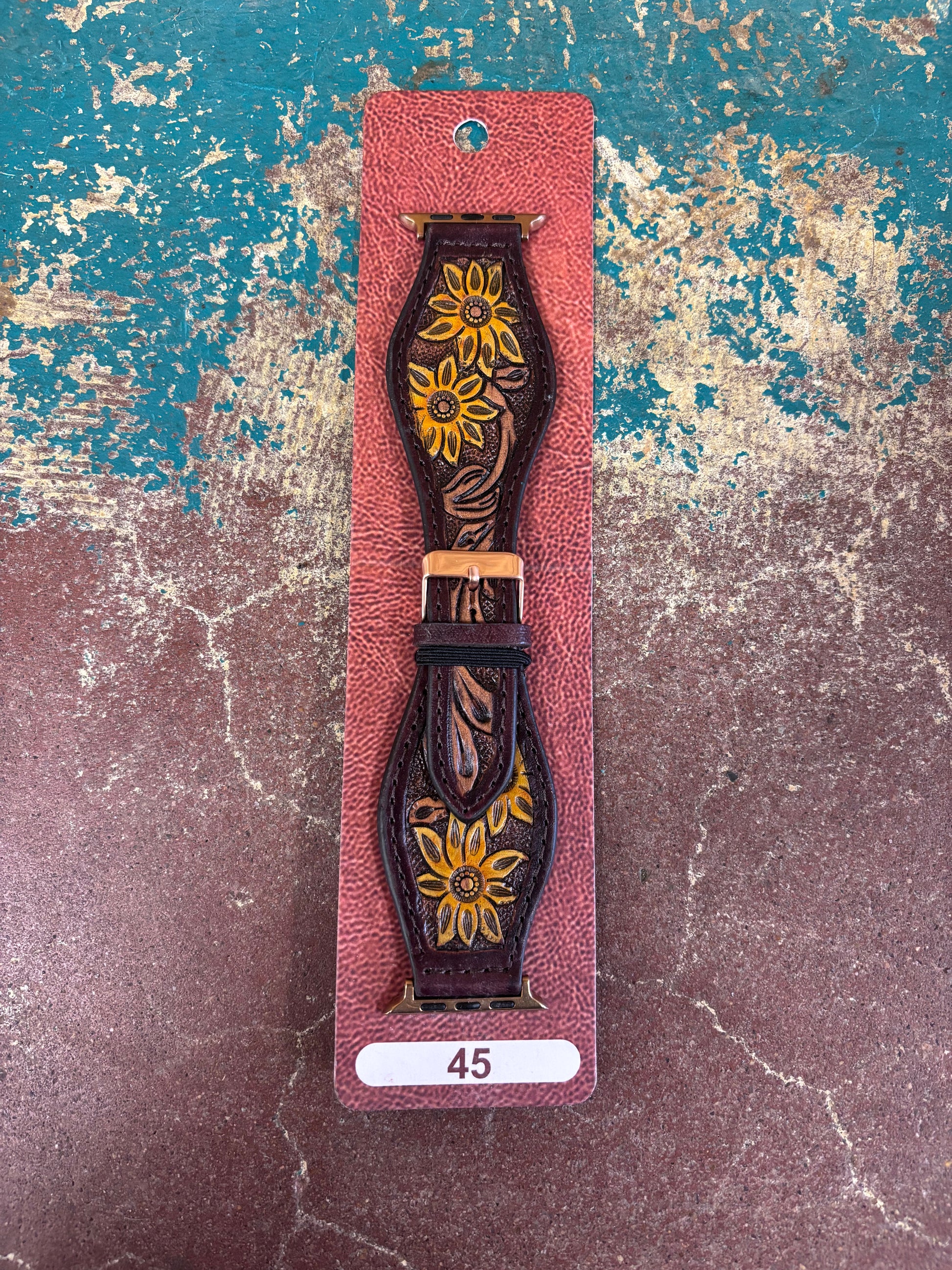 Elevate your wrist with this striking Dark Brown Leather Sunflower Tooled Watchband. Measuring 7 inches long and 2 inches wide, this handcrafted piece features rich dark brown leather adorned with vibrant yellow sunflower tooling that catches the eye. The artisanal detailing brings warmth and character to any timepiece, making it the perfect accessory for those who appreciate authentic craftsmanship and nature-inspired design. A versatile statement piece that pairs beautifully with both casual and dressed up looks.
