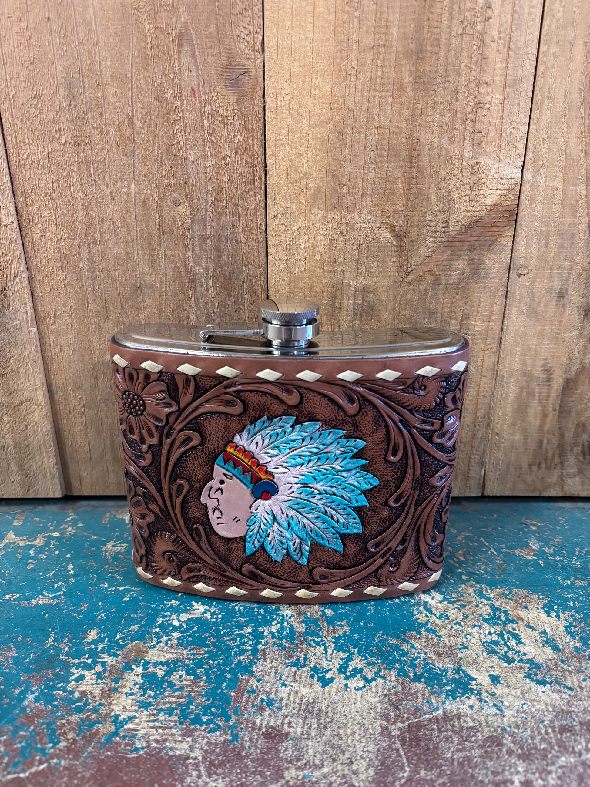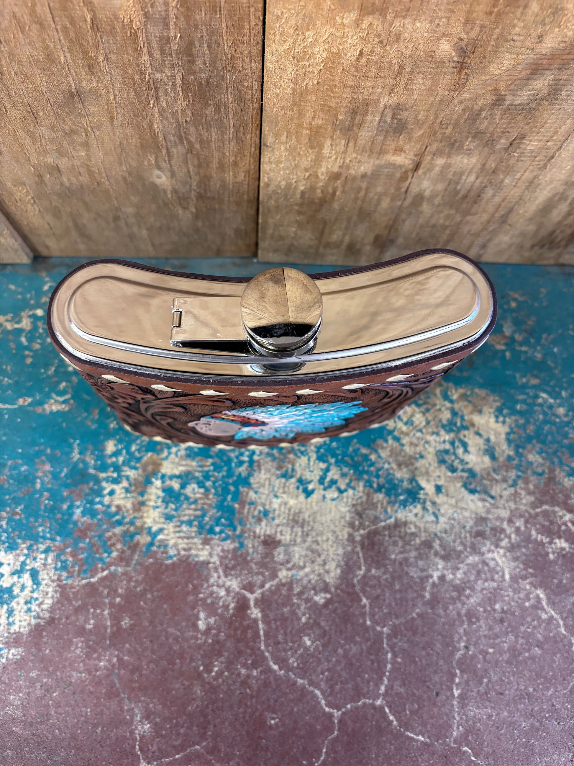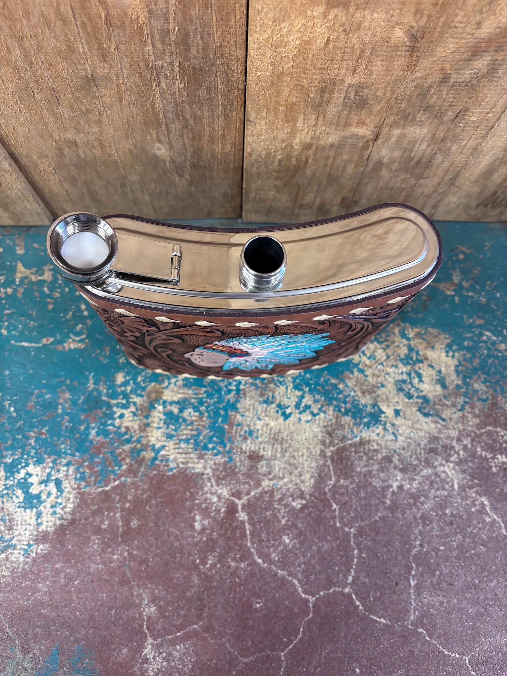 Carry your favorite beverage in style with this handcrafted Flower Tooled Indian Flask. Standing 5.5 inches tall and 7.5 inches wide, it's the perfect portable companion for any adventure. In the center of the flask is a tooled Indian with his eye-catching headpiece. Featuring distinctive buck stitching along the edges and polished silver tops and bottom, this flask combines rugged durability with refined craftsmanship. The secure screw-on lid keeps your drink fresh and protected, whether you're heading to the ranch, the road, or anywhere in between. A timeless piece that proves functionality and artistry go hand in hand.
