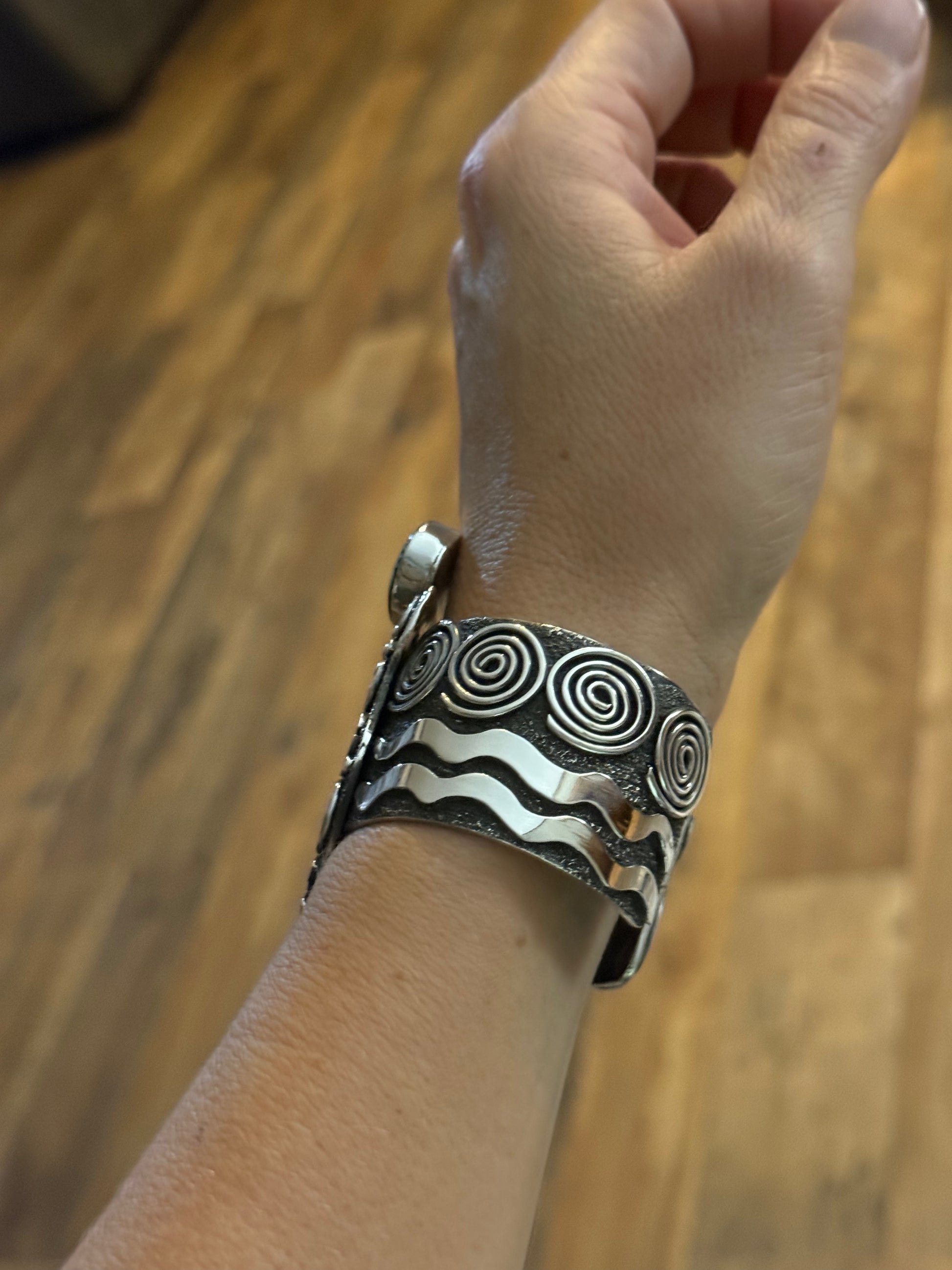Crafted in sterling silver by renowned Navajo artisan Alex Sanchez, this wide cuff honors the strength and wisdom of grandmothers through its meaningful design. Luminous Kingman Web turquoise—prized for its distinctive matrix patterns—is set against hand-stamped .925 sterling silver detailing that captures the essence of family legacy. The generous width makes a bold statement while remaining comfortable for everyday wear. A treasured piece that celebrates heritage, love, and the enduring bond between generations.