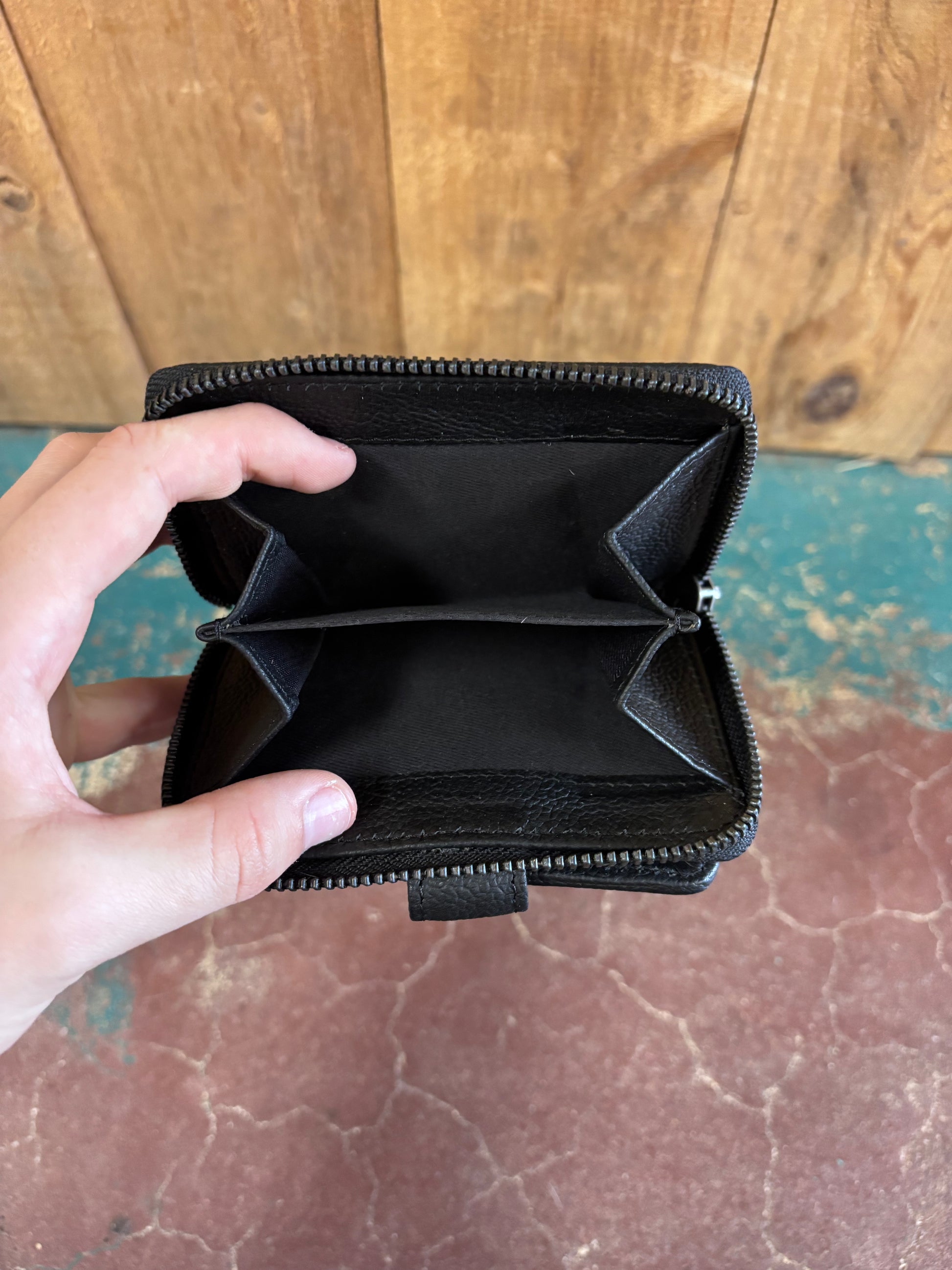 Compact yet spacious, this wrist wallet combines rugged grey cowhide with supple black leather for a look that's both practical and refined. Measuring 4 inches tall by 5 inches long, it fits comfortably on your wrist with an adjustable black leather strap. The buttoned flap secures cards and cash, while a dedicated zip pocket keeps coins organized and accessible. Perfect for hands-free carrying on the go—whether you're traveling, shopping, or simply want to lighten your load without sacrificing essentials.