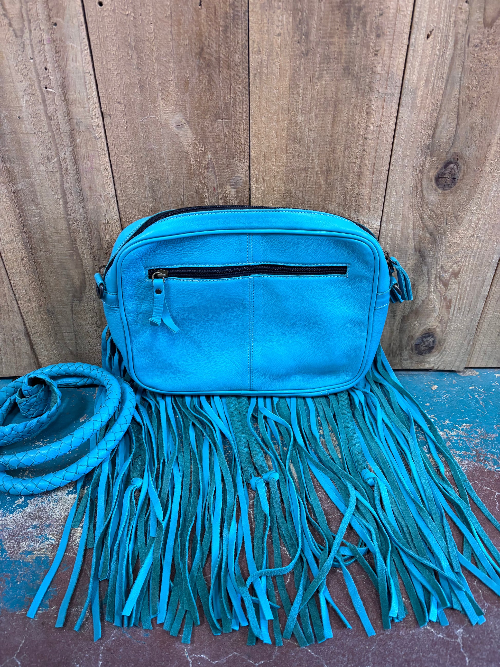 Handcrafted grey cowhide purse featuring striking turquoise fringe detailing in both classic and braided styles. This 9" x 12" statement piece combines rustic charm with practical design. A front cowhide pocket with braided trim, rear zip closure, and interior organization with two standard pockets plus an additional zippered compartment. Finished with a matching turquoise braided leather strap for an authentic, artisanal look. Perfect for those who appreciate genuine craftsmanship and bold southwestern style.