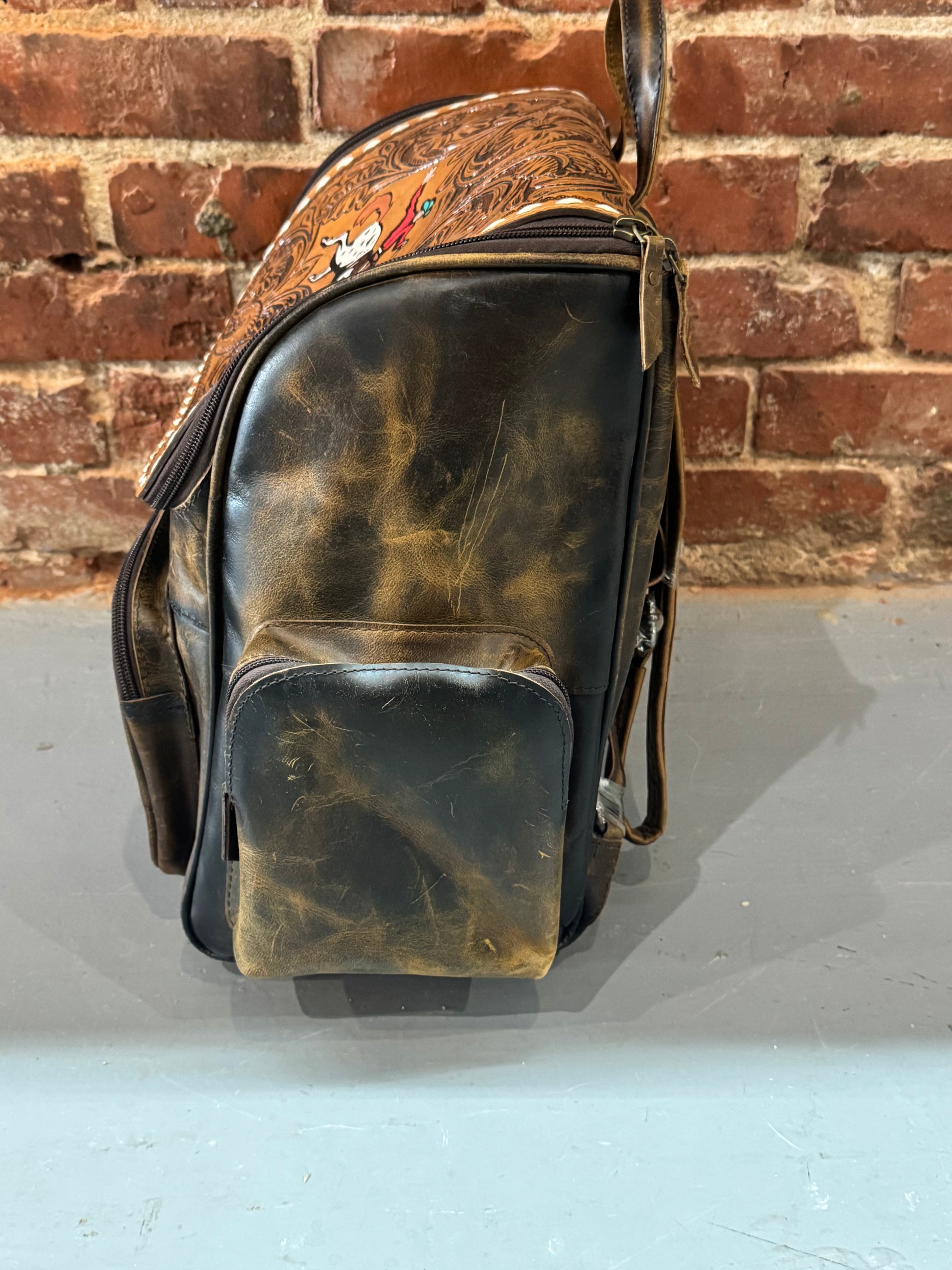Handmade leather backpack with cowboy on horse
