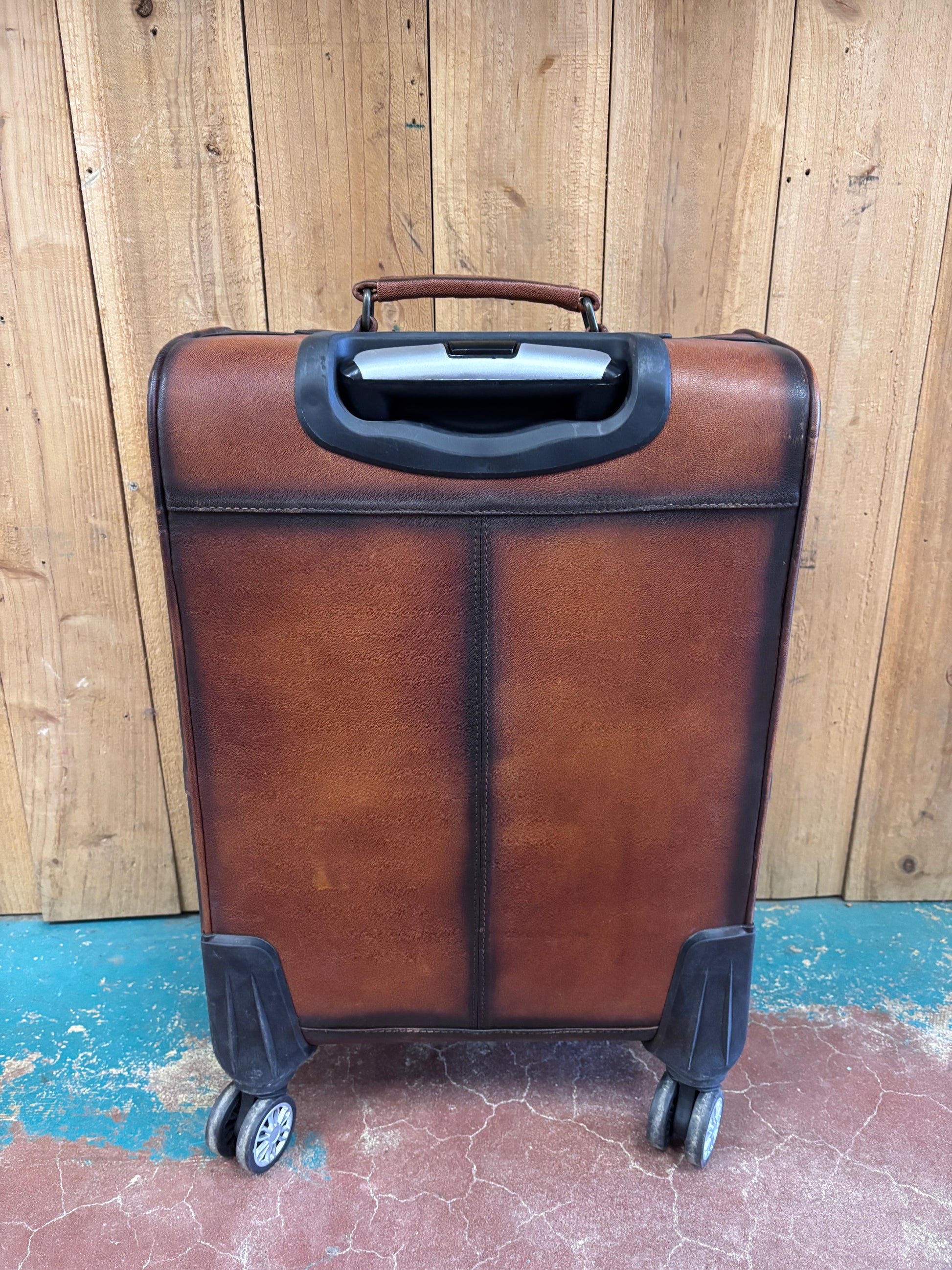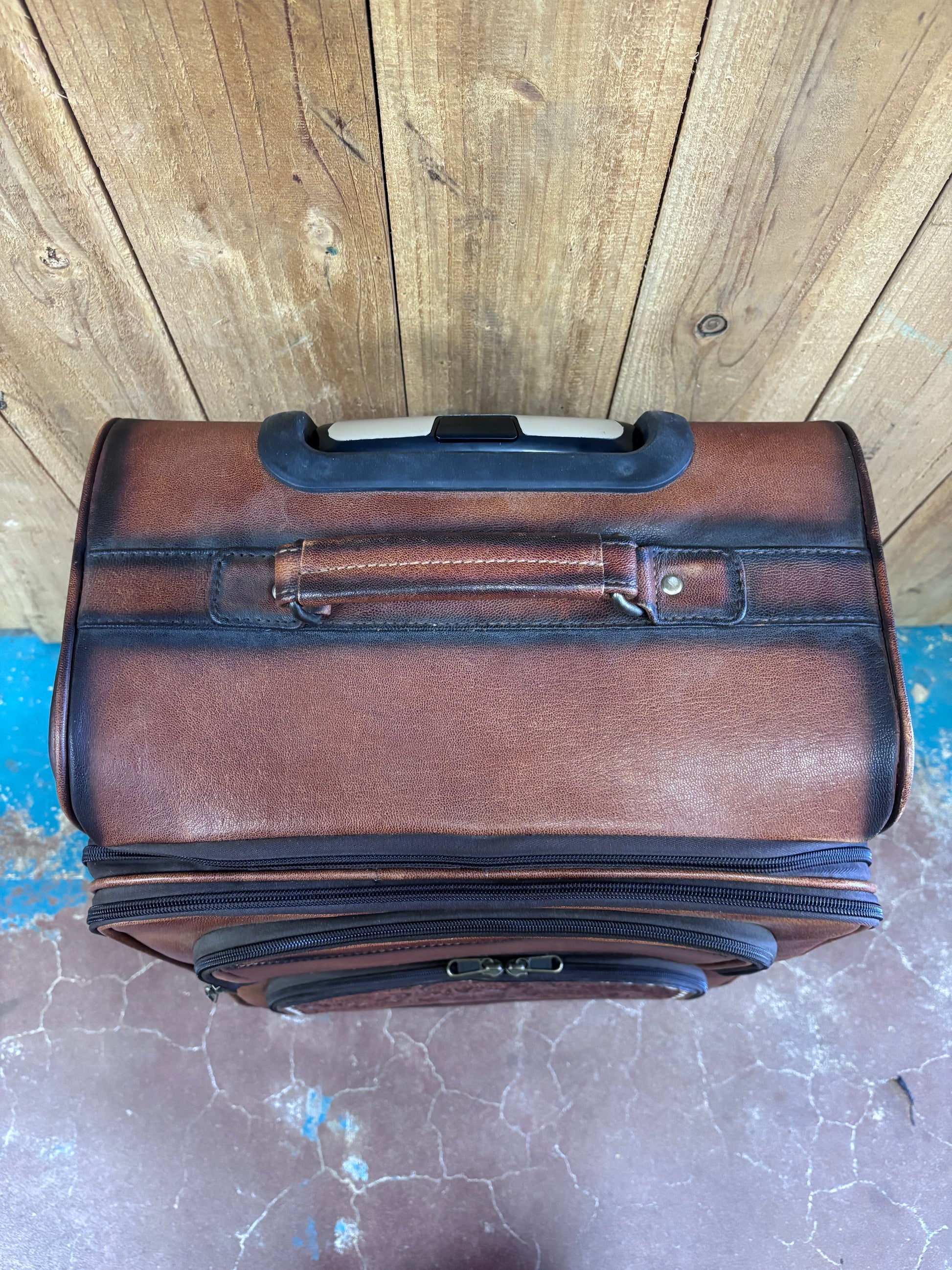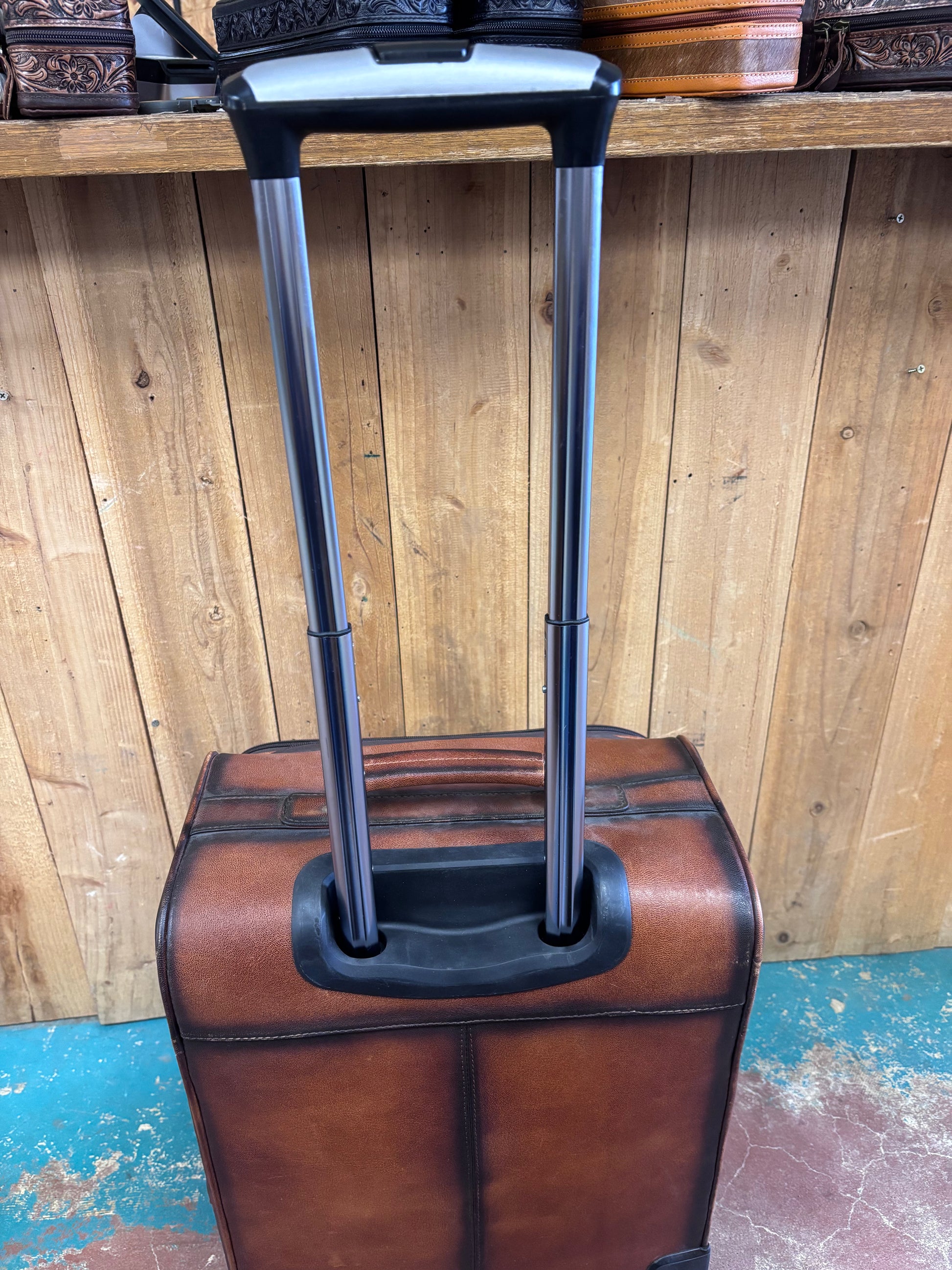 This spacious 20-inch tall, 15-inch wide suitcase combines rugged functionality with authentic Western craftsmanship. Hand-tooled brown leather features intricate buck stitching and a signature flower design on the front pocket, making it as striking as it is durable. The dual-handle system—a sturdy fixed grip plus an extending telescoping handle that reaches 19 inches—adapts to your travel style. Four exterior pockets provide quick access, while the interior delivers smart organization: a large zippered pocket with securing strap and buckle in the first compartment, a spacious side pocket, and divided storage with three sections in the second. Smooth-rolling wheels make navigating airports and roads effortless. Built for travelers who refuse to compromise between style and practicality.