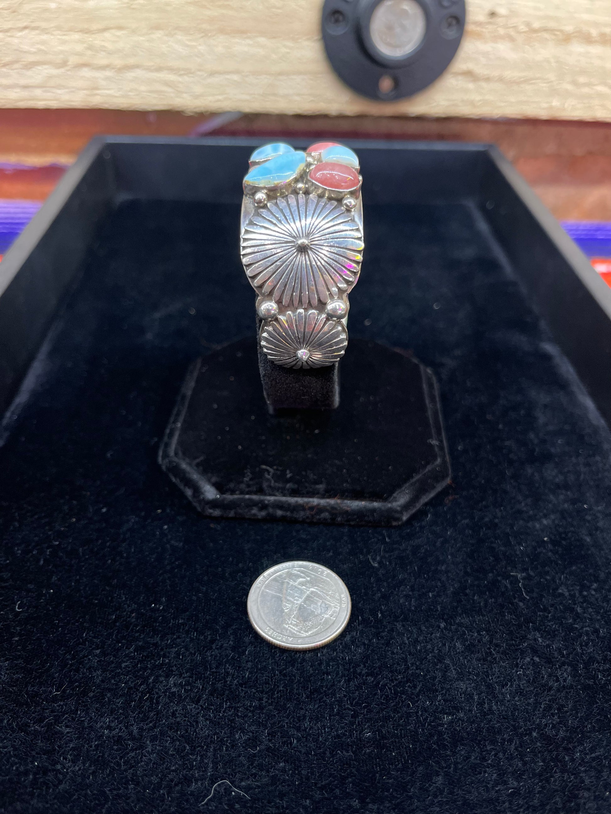 This cuff features various cut shapes of larimar turquoise and rhodochrosite crystal is 1" thick and measures at a size 6 3/4” with uniquely engraved discs at both ends of the cuff.