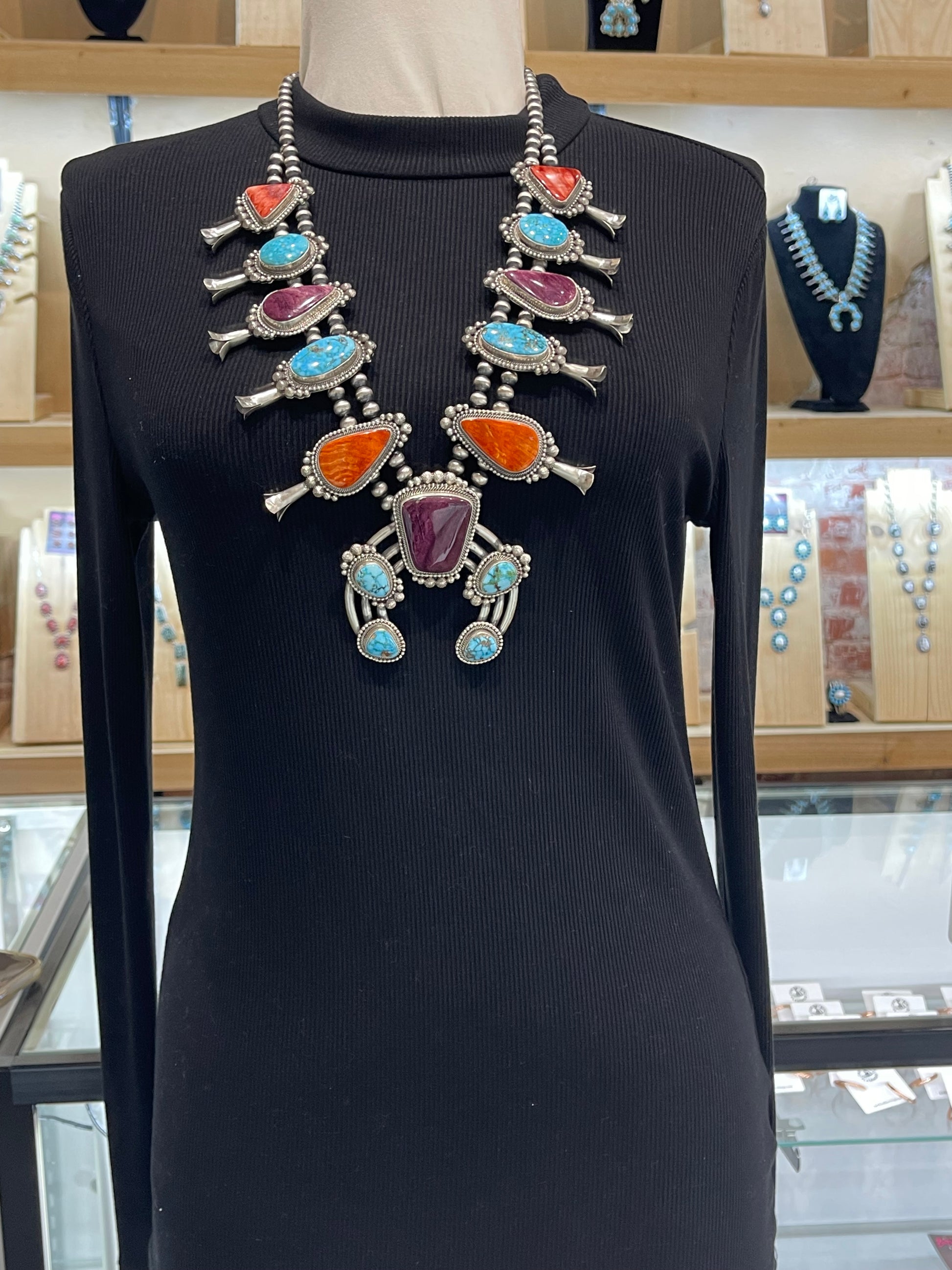 Elevate your collection with this stunning 28" Multi Stone Squash Blossom Necklace by acclaimed Navajo artist Tom Lewis. Expertly crafted, it features vibrant stones set in traditional silverwork that reflects rich Native American heritage. Perfect for making a bold statement, this necklace enhances any outfit with its unique blend of artistry and cultural significance. Wear a piece of timeless craftsmanship that connects you to authentic Navajo tradition.