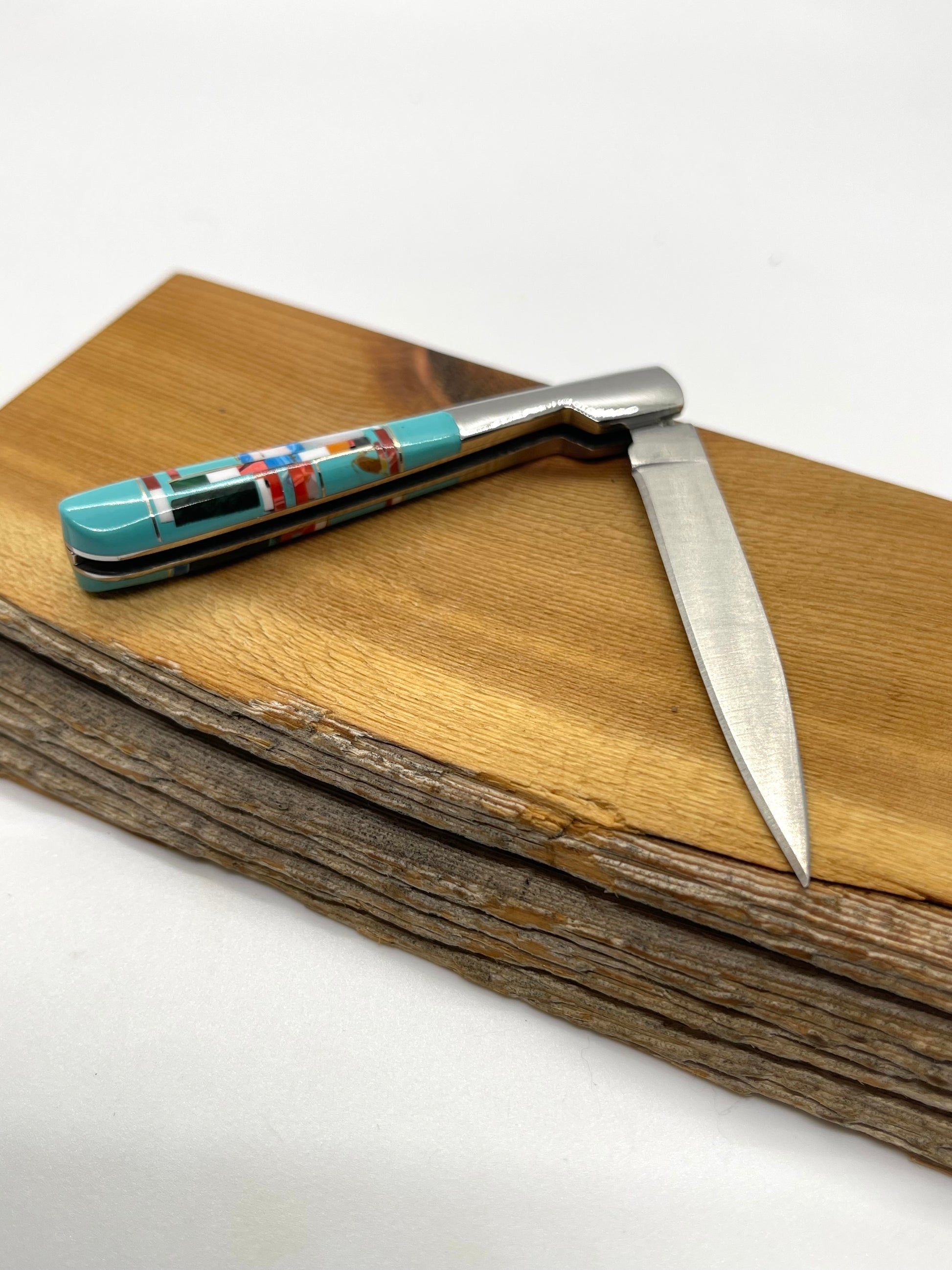 Introducing our Small Inlaid Multi Stone Knife, the perfect combination of functionality and beauty! This knife features a unique inlaid design with multiple stones, adding a touch of elegance to any collection. With its compact size, it's perfect for on-the-go use and makes a great gift for any knife enthusiast. Elevate your cutting experience with our Small Inlaid Multi Stone Knife!