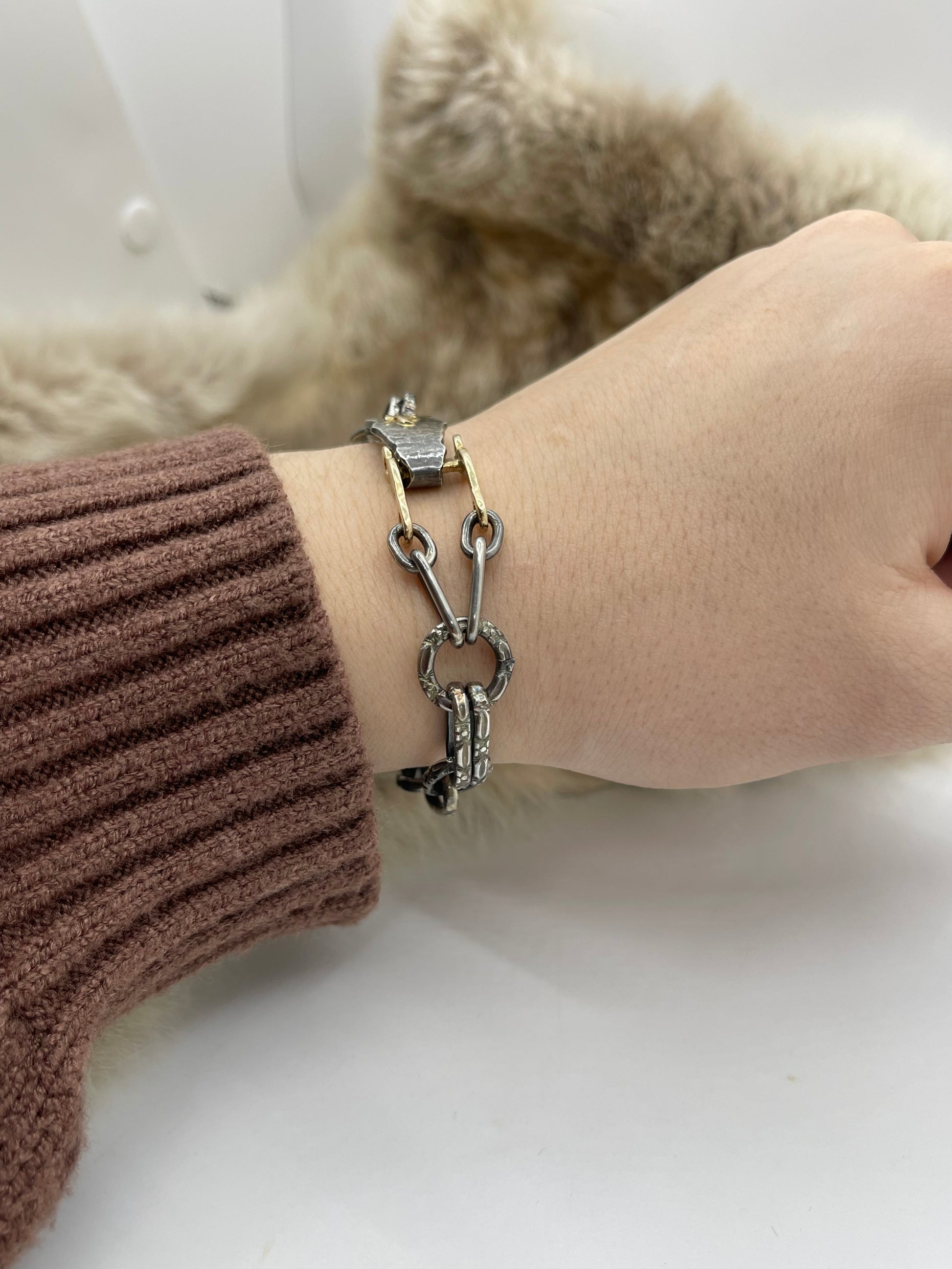 This stunning bracelet combines the warmth of 14k gold with the timeless elegance of sterling silver in a design inspired by the iconic "Long Trot" aesthetic. Crafted by Bad Bronc, this 7.75" piece showcases masterful metalwork that blends two precious metals for a sophisticated look that transitions seamlessly from everyday wear to special occasions. The mixed-metal design offers versatility while the quality construction ensures lasting beauty. A perfect statement piece for those who appreciate artisan craftsmanship and refined style.