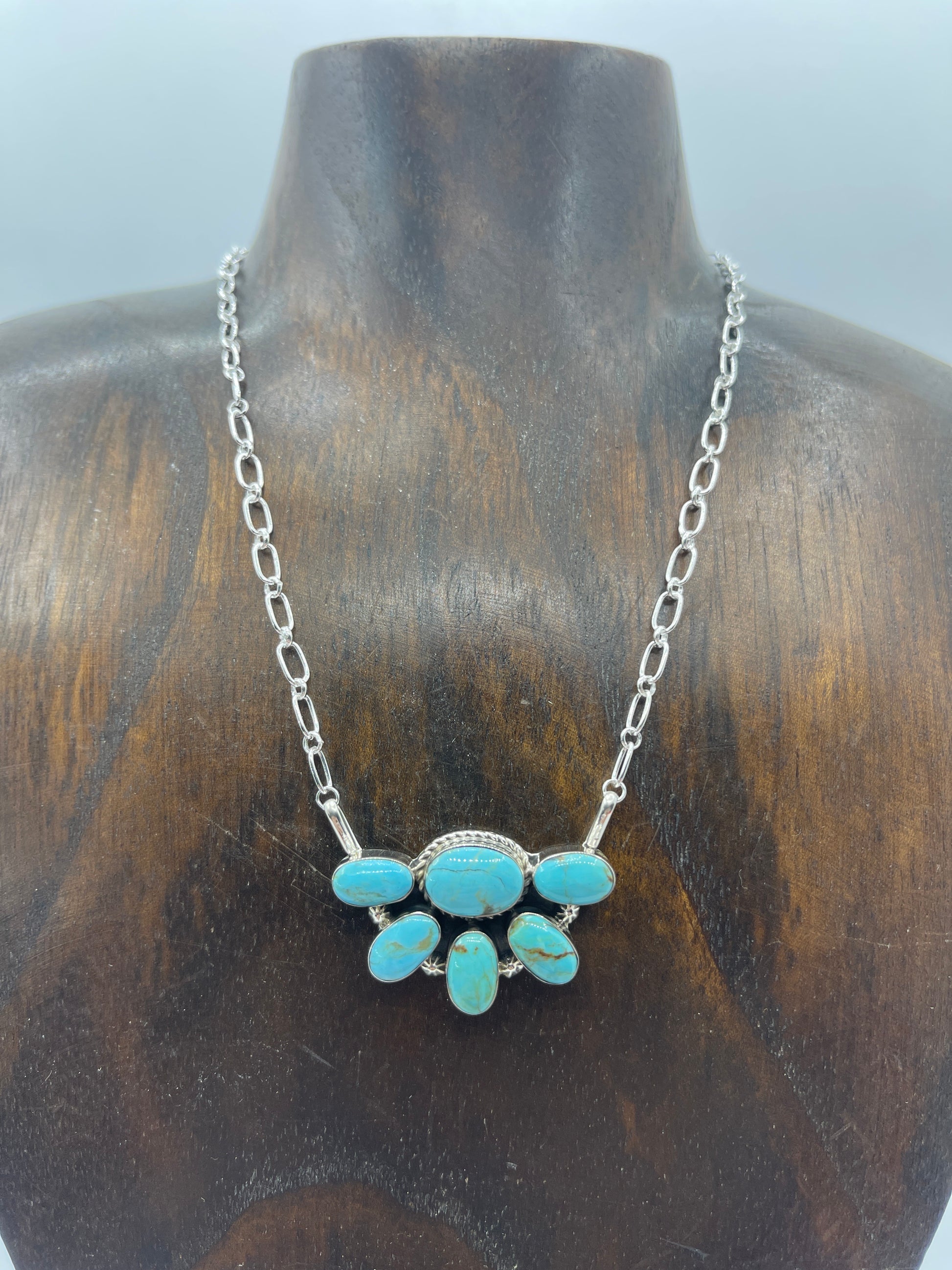 Elevate your jewelry collection with this stunning Half Cluster Turquoise Necklace, a masterpiece by renowned Navajo artisan Kimberly Yazzie. Crafted from genuine sterling silver and featuring vibrant turquoise stones arranged in an eye-catching cluster design, this 18" necklace combines traditional Native American craftsmanship with timeless elegance. The half cluster setting creates a bold focal point that catches light beautifully, making it perfect for both everyday wear and special occasions. Each piece reflects authentic artistry and quality materials that will become a cherished addition to your accessory wardrobe.