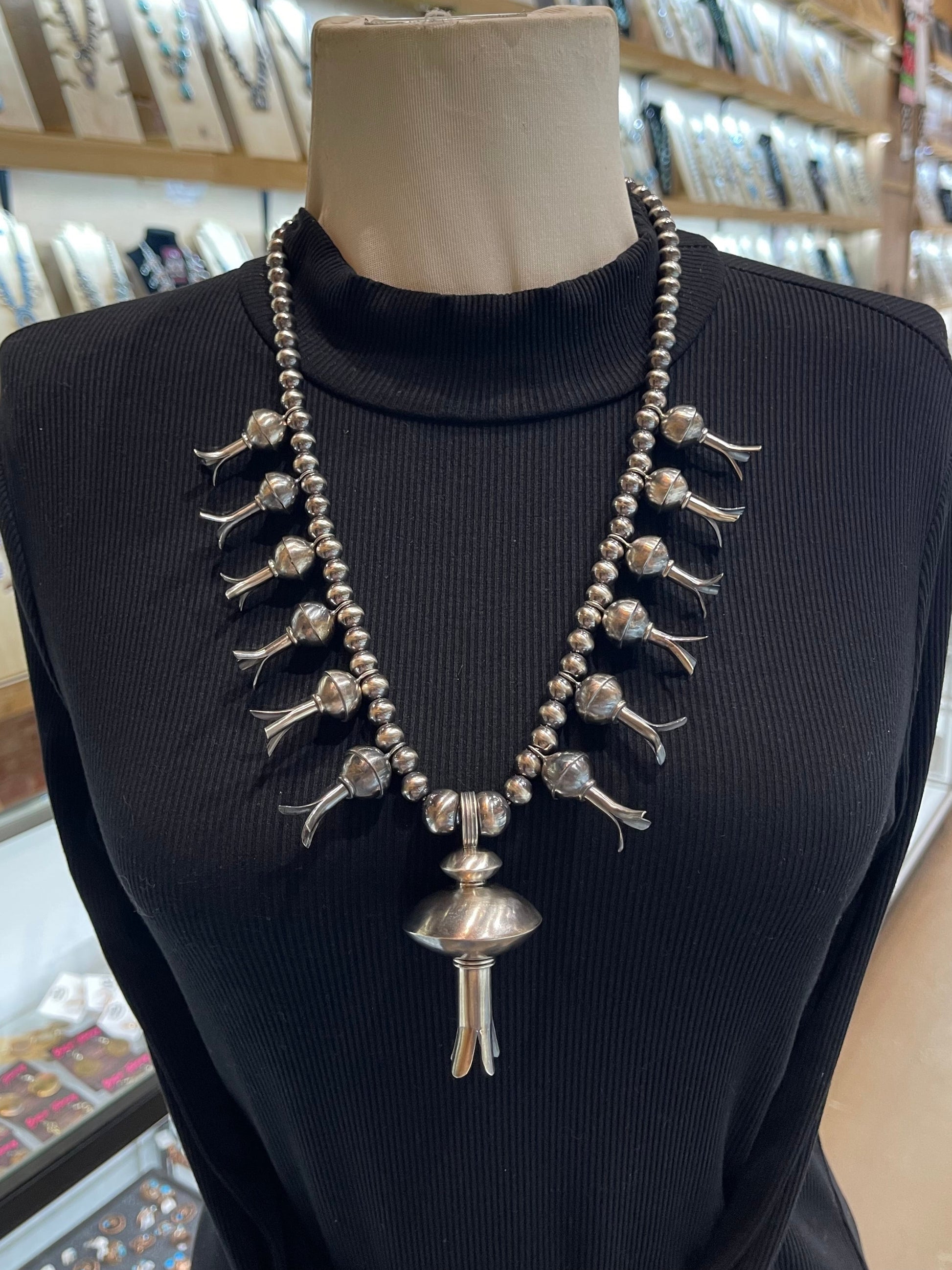 24" 7.5mm Navajo Style Pearls Squash Blossom Necklace