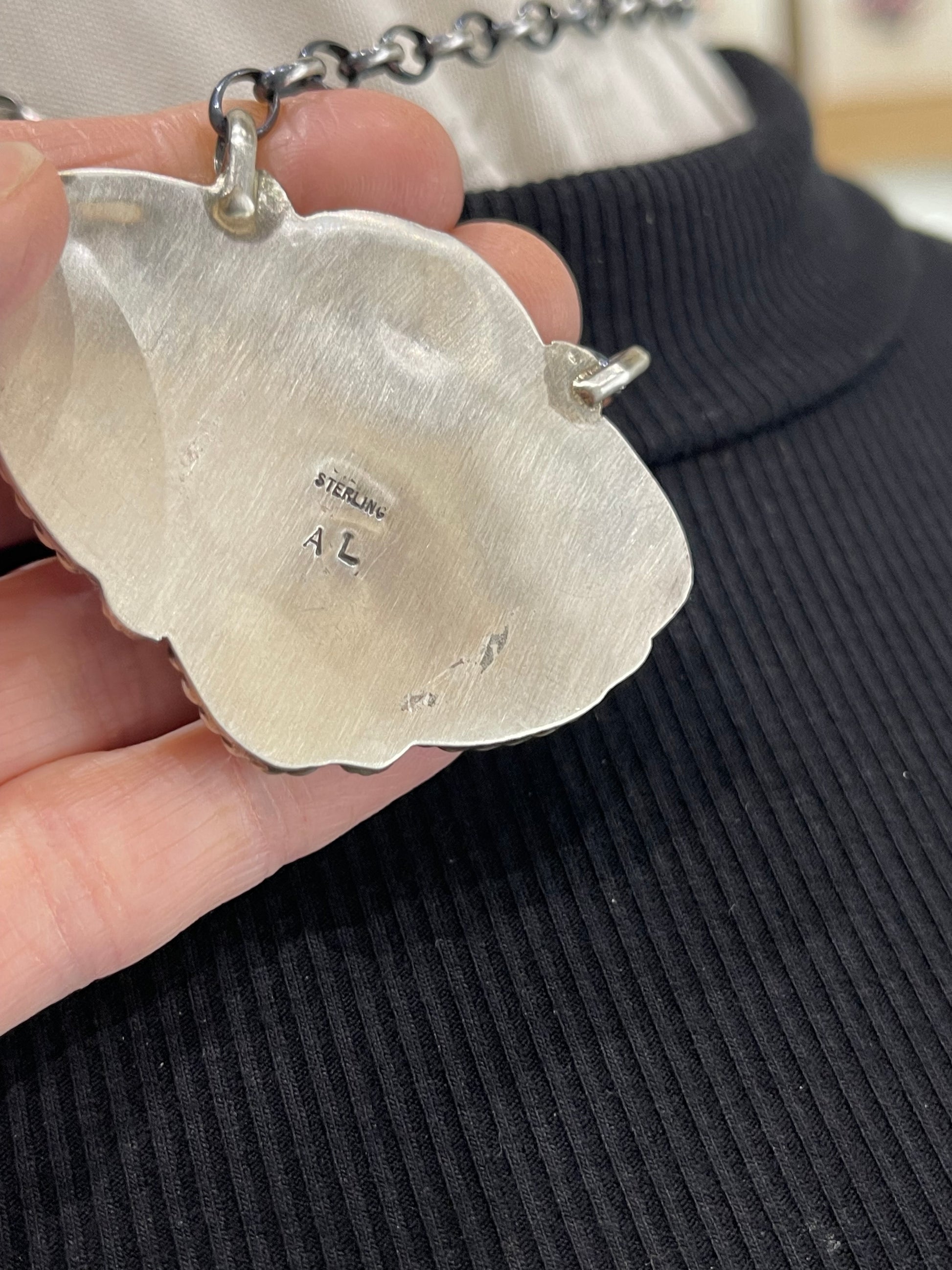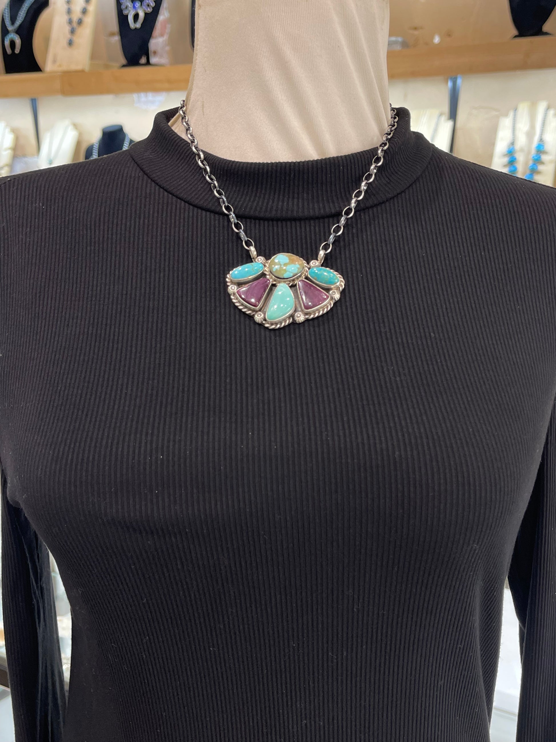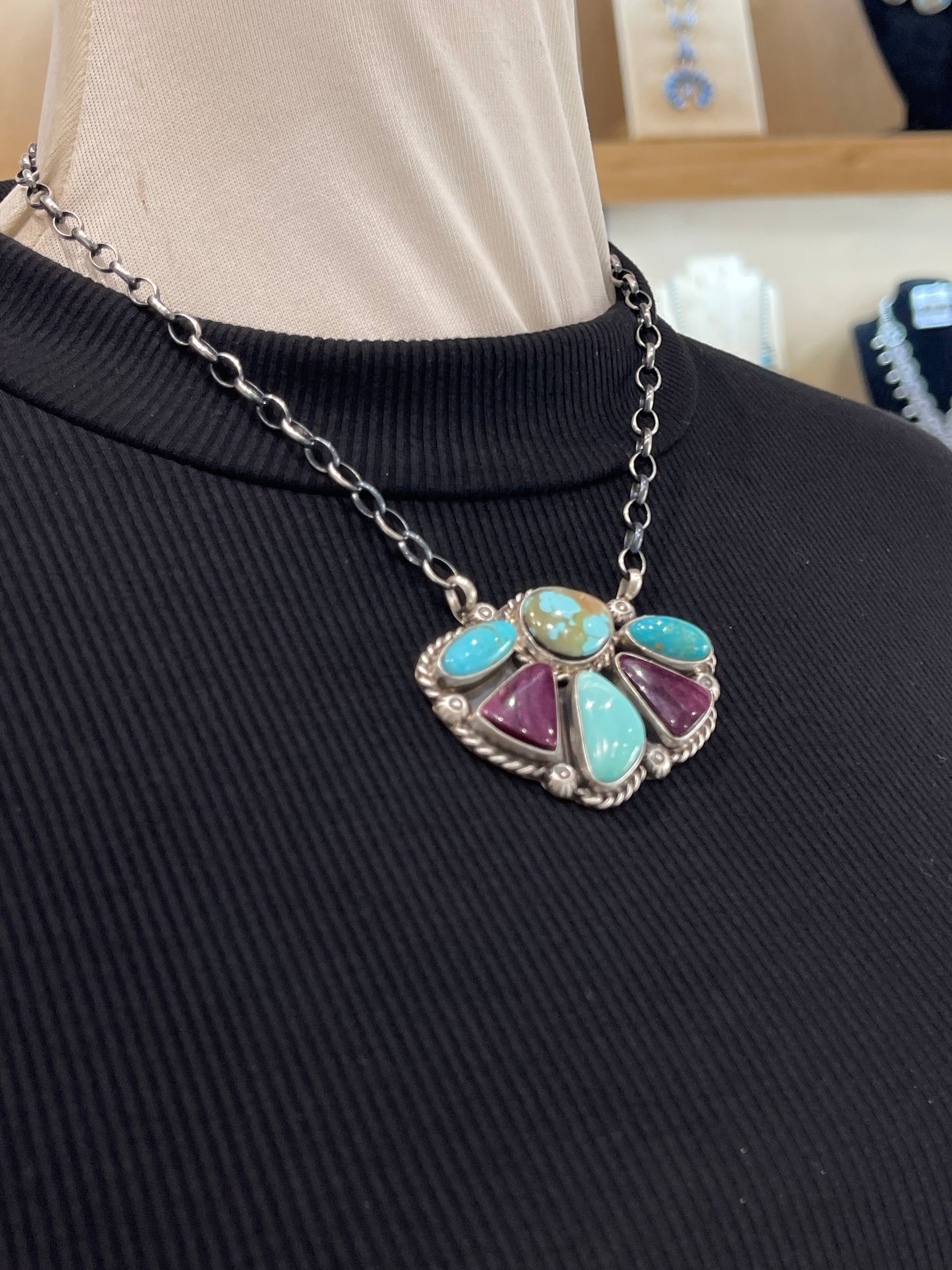 Handcrafted by renowned Navajo artisan Augustine Largo, this striking 18" necklace showcases a captivating cluster of natural #8 turquoise and vibrant spiny oyster set in lustrous sterling silver. Each stone is carefully selected and arranged to create a bold, eye-catching pendant that celebrates authentic Southwestern artistry. The combination of cool turquoise tones and purple-hued oyster shell creates stunning visual contrast, while the premium sterling silver setting ensures lasting durability and timeless elegance. A true collector's piece that brings genuine Native American craftsmanship to your everyday style.