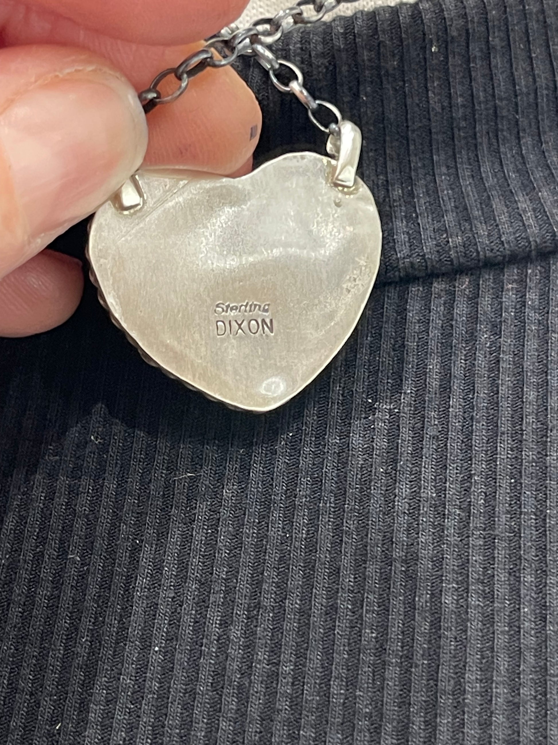 Capture hearts with this enchanting 18-inch necklace by Navajo master Johnny Dixon. A heart-shaped Kingman turquoise stone—celebrated for its mesmerizing blue-green tones—is delicately set in sterling silver, blending romantic symbolism with Southwest heritage. The sterling silver setting enhances the stone's natural radiance while ensuring lasting durability. Perfect for those seeking meaningful jewelry that expresses both personal style and appreciation for authentic Native American craftsmanship. A timeless piece that speaks to the soul.
