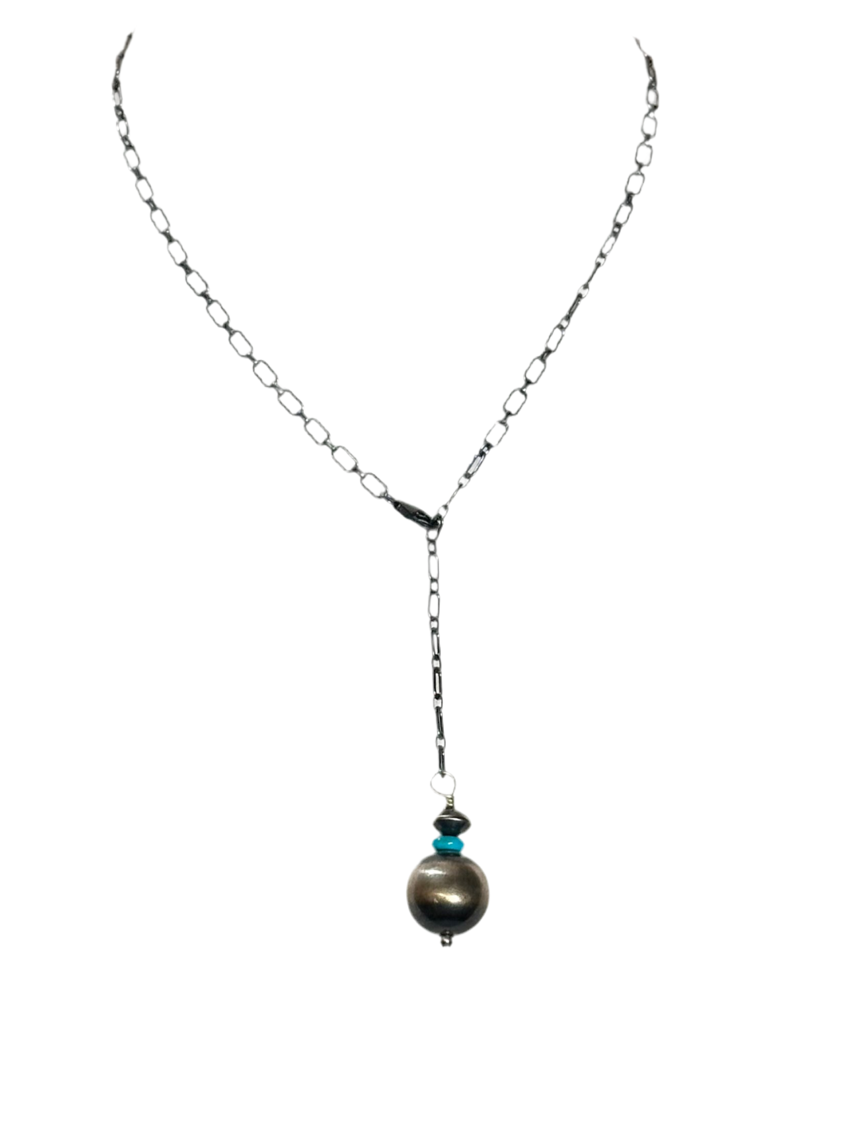 Experience the beauty of the Southwest with our 18" adjustable lariat style necklace featuring a 16mm Navajo Pearl and stunning turquoise accent.
