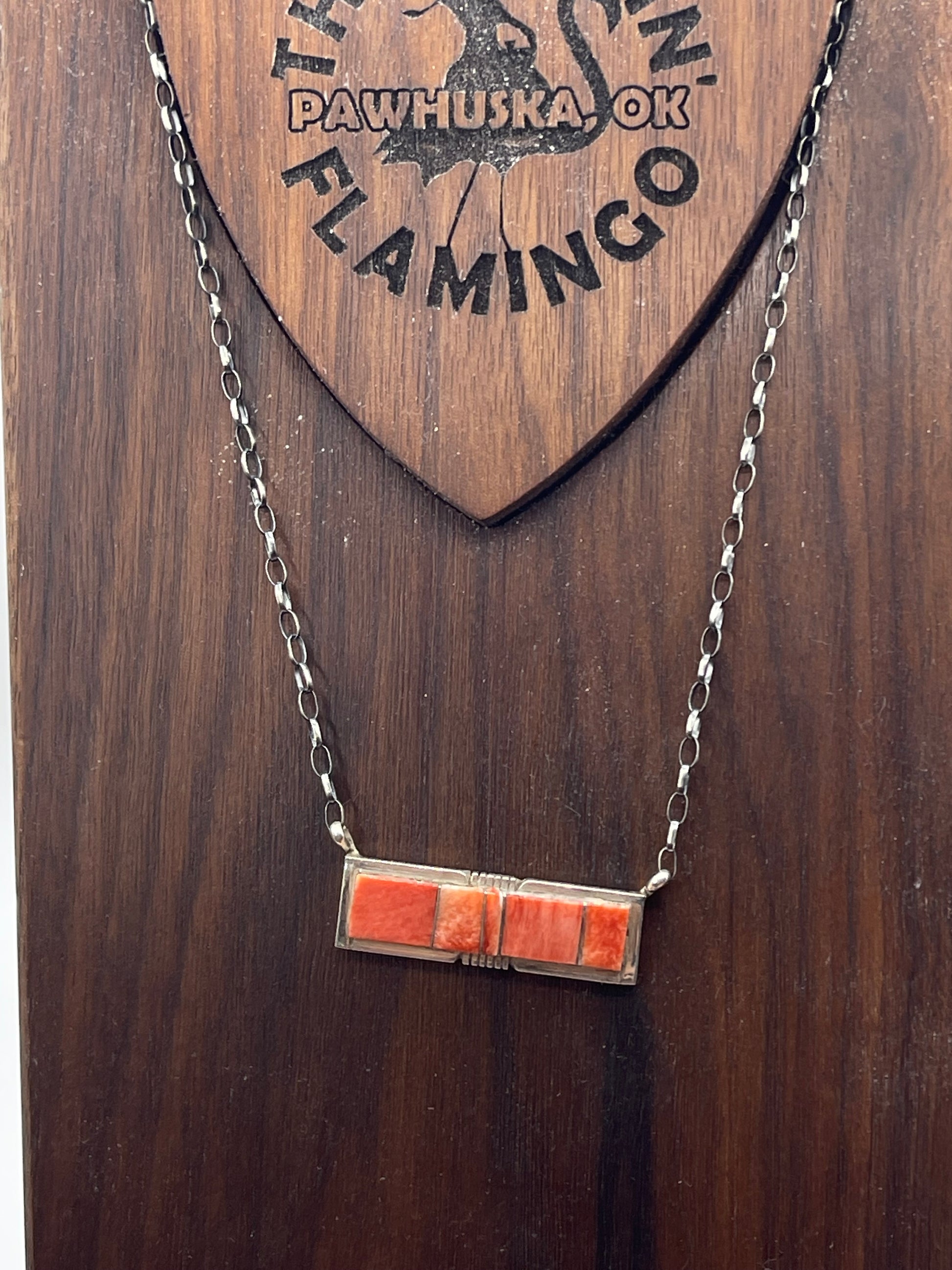 18" Red Spiny Oyster Shell Inlay Bar Necklace by Steve Francisco, Navajo