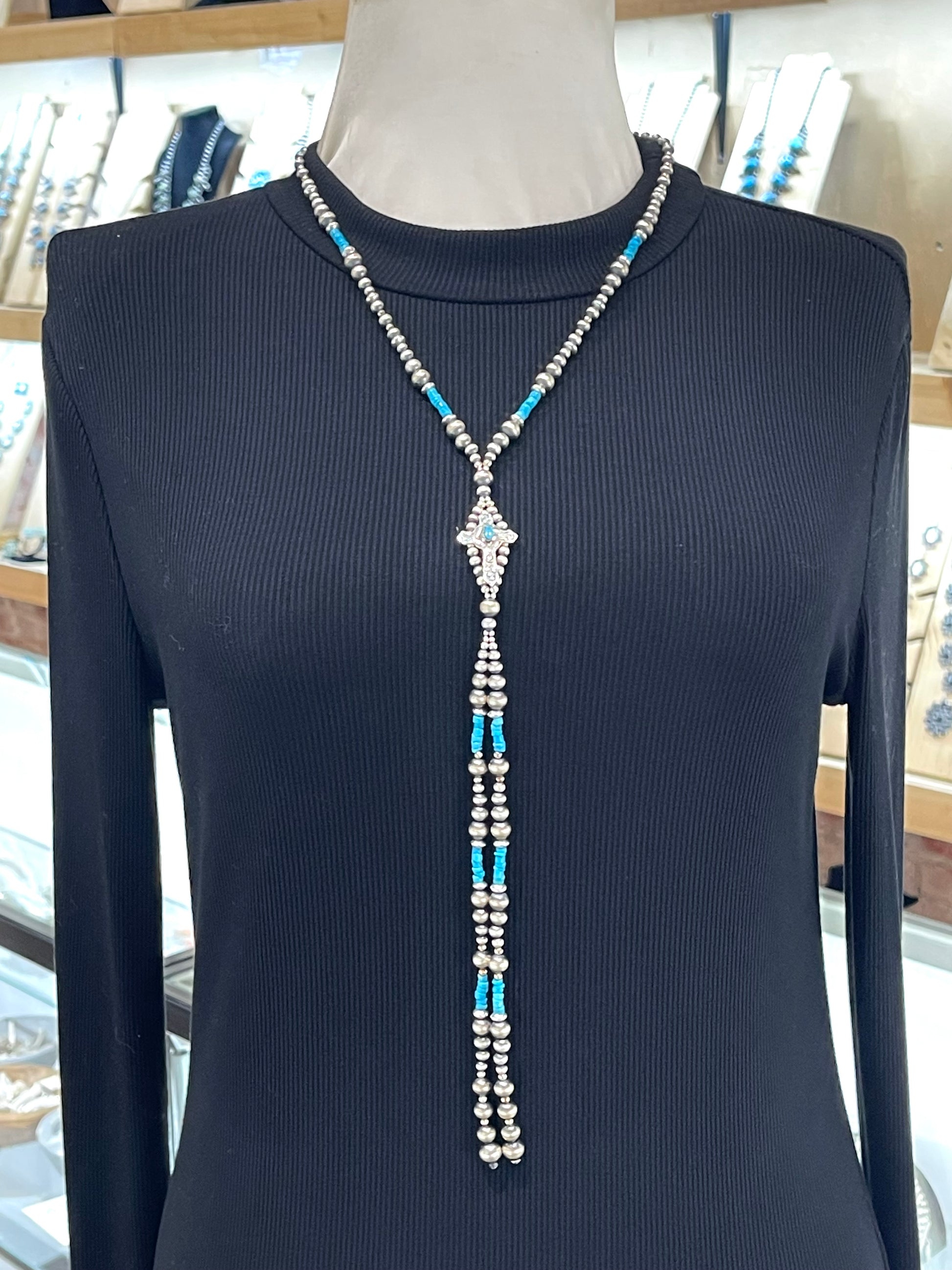 Elevate your jewelry collection with this stunning Navajo-style pearl lariat necklace, handcrafted by renowned artisan Lucinda Sardo. Featuring lustrous pearls suspended from sterling silver, this versatile piece measures 18 inches with a 3-inch extender, offering an 8-inch drop for graceful movement and presence. The lariat design drapes beautifully, adapting to your personal style whether worn long or layered. Each piece carries the authentic heritage and meticulous craftsmanship of traditional Navajo artistry, making it a timeless investment for those who appreciate genuine, handmade jewelry with cultural significance.