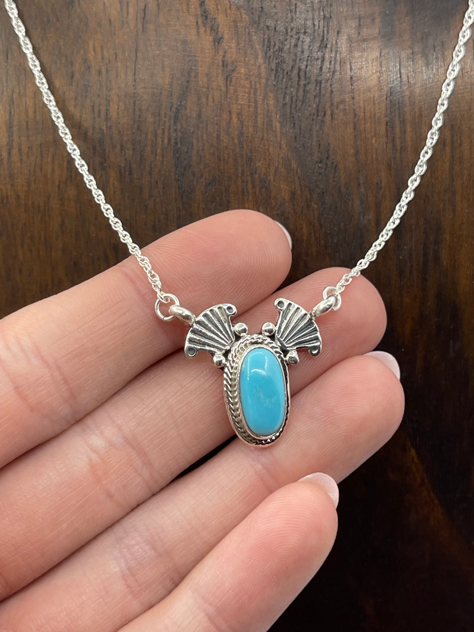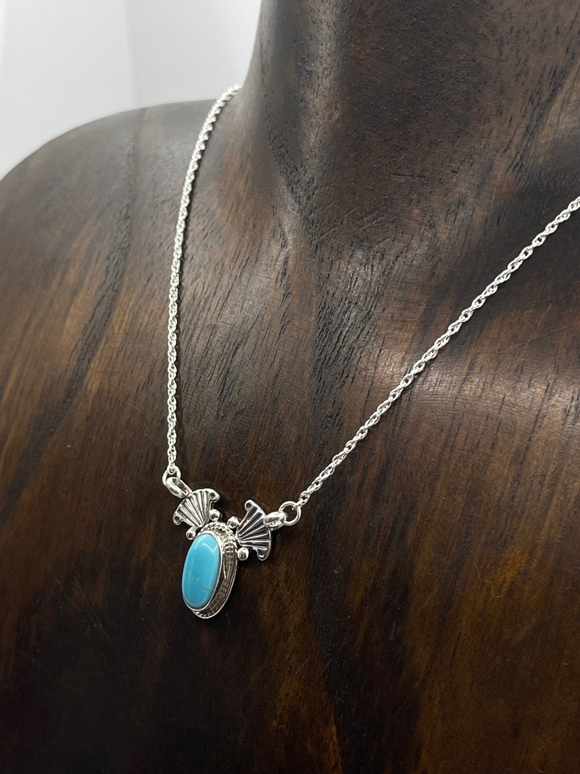 Elevate your style with this exquisite 18" Turquoise Oval Necklace crafted by renowned Navajo artisan Verley Betone. This stunning piece showcases authentic turquoise in an elegant oval setting, perfectly balanced on an 18-inch chain that sits beautifully at the collarbone. Each necklace represents generations of Navajo craftsmanship and brings a touch of Southwestern elegance to any outfit. Don't miss your chance to own this unique, artisan-made treasure.