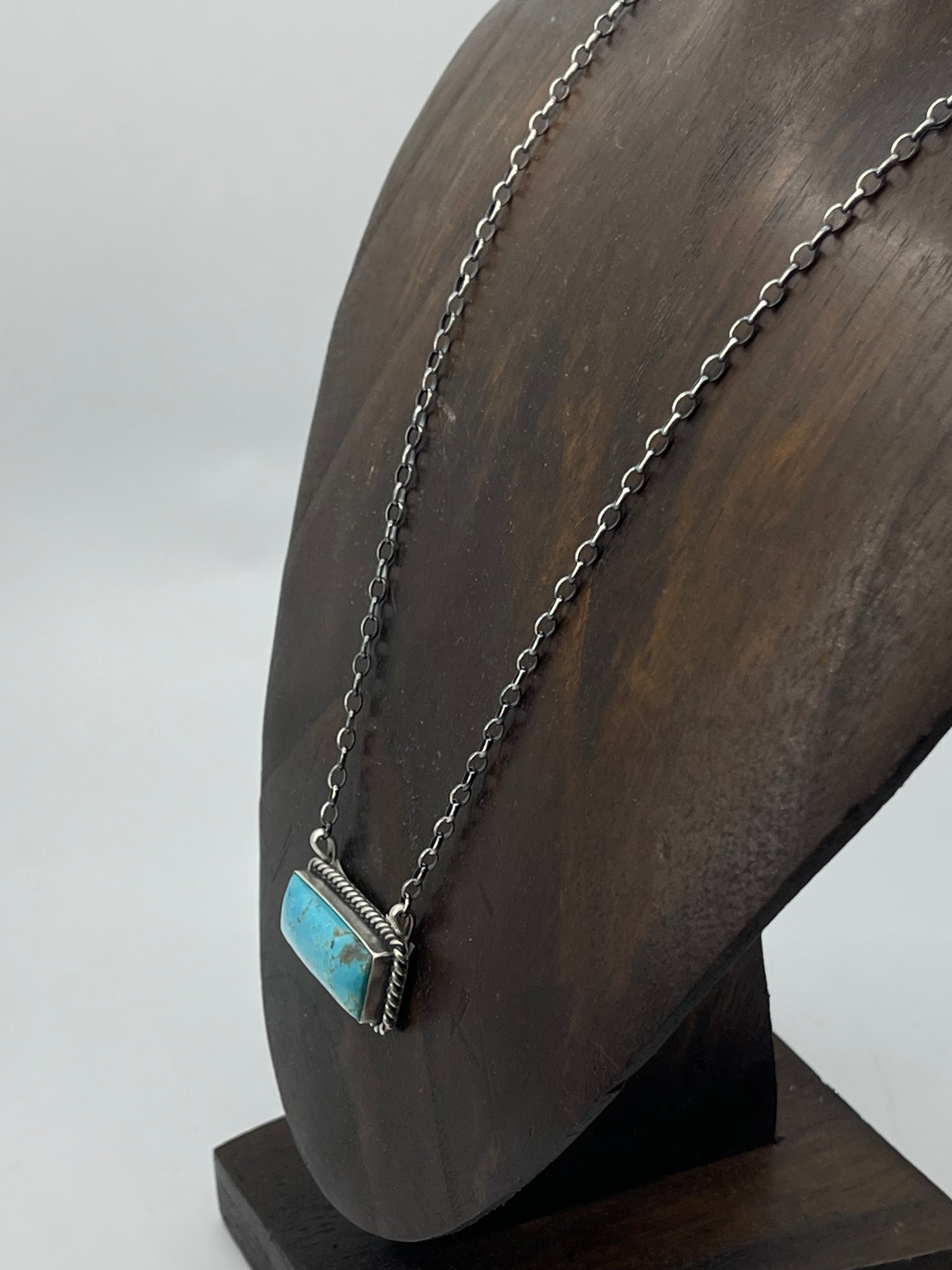 Elevate your style with the Kingman Turquoise Bar Necklace, featuring a stunning turquoise bar sourced from the renowned Kingman mine. Its vibrant blue-green hues add a unique, natural touch to any outfit, making it perfect for everyday wear or special occasions. Lightweight and versatile, this necklace effortlessly complements both casual and elegant looks, bringing a timeless southwestern charm to your jewelry collection. Embrace the beauty of authentic turquoise and stand out with a piece that truly speaks to your individuality.