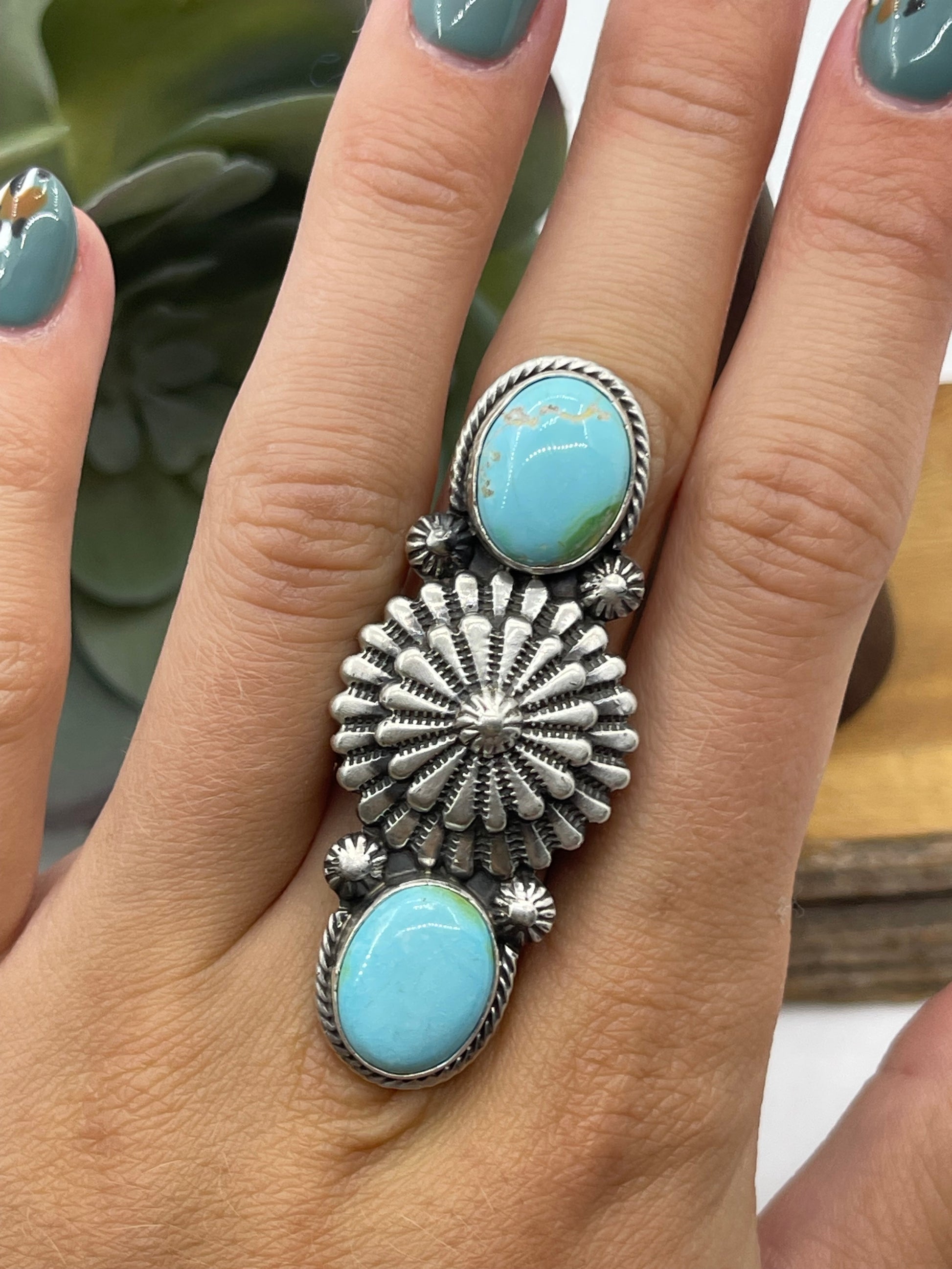 Discover the exquisite craftsmanship of the 6.0 2 Stone Sonoran Gold Turquoise Ring by Navajo artist Samuel Yellowhair. Featuring vibrant Sonoran gold turquoise stones set in a bold design, this ring combines cultural heritage with timeless elegance. Perfect for those who appreciate unique, handcrafted jewelry that makes a statement. Elevate your collection with a piece that reflects artistry and tradition.
