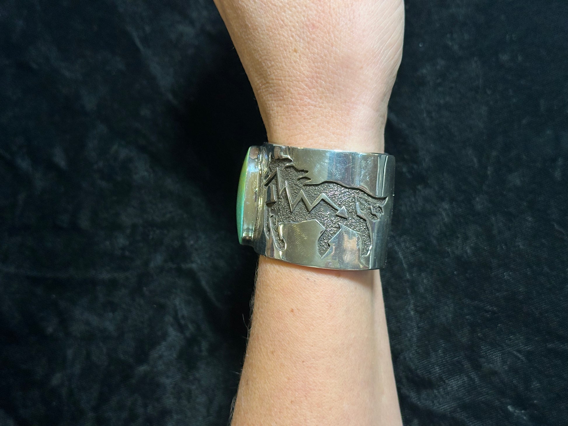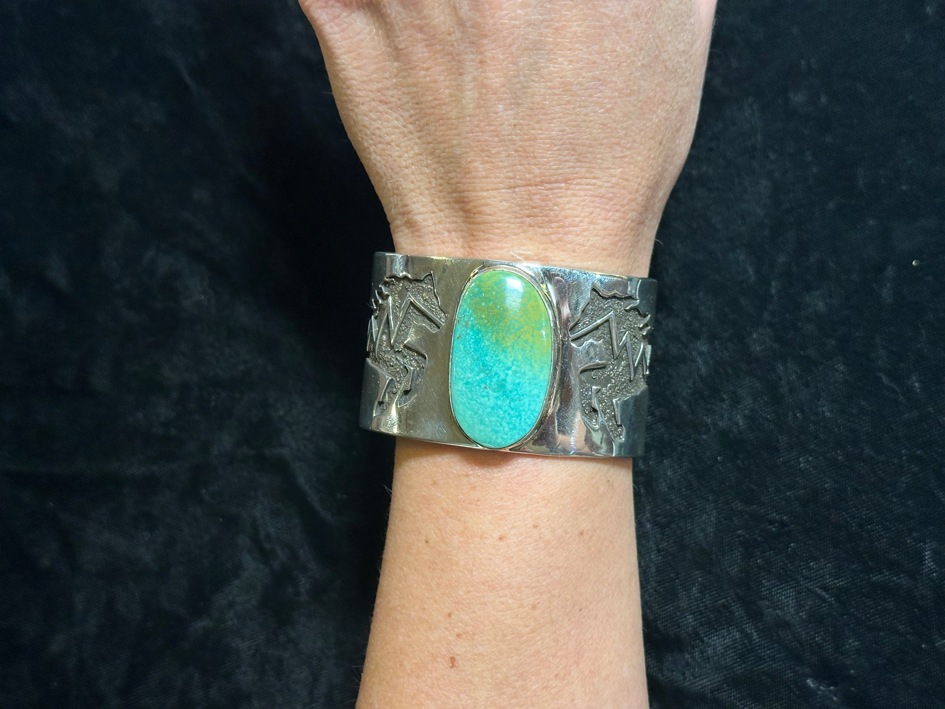 Expertly crafted by Marie Jackson, this Kingman Turquoise Cuff in size 6 1/4 is a true masterpiece. Made with heavy sterling silver, this cuff is both durable and elegant. The beautiful Kingman turquoise adds a pop of color and unique flair. A must-have for any jewelry collection.