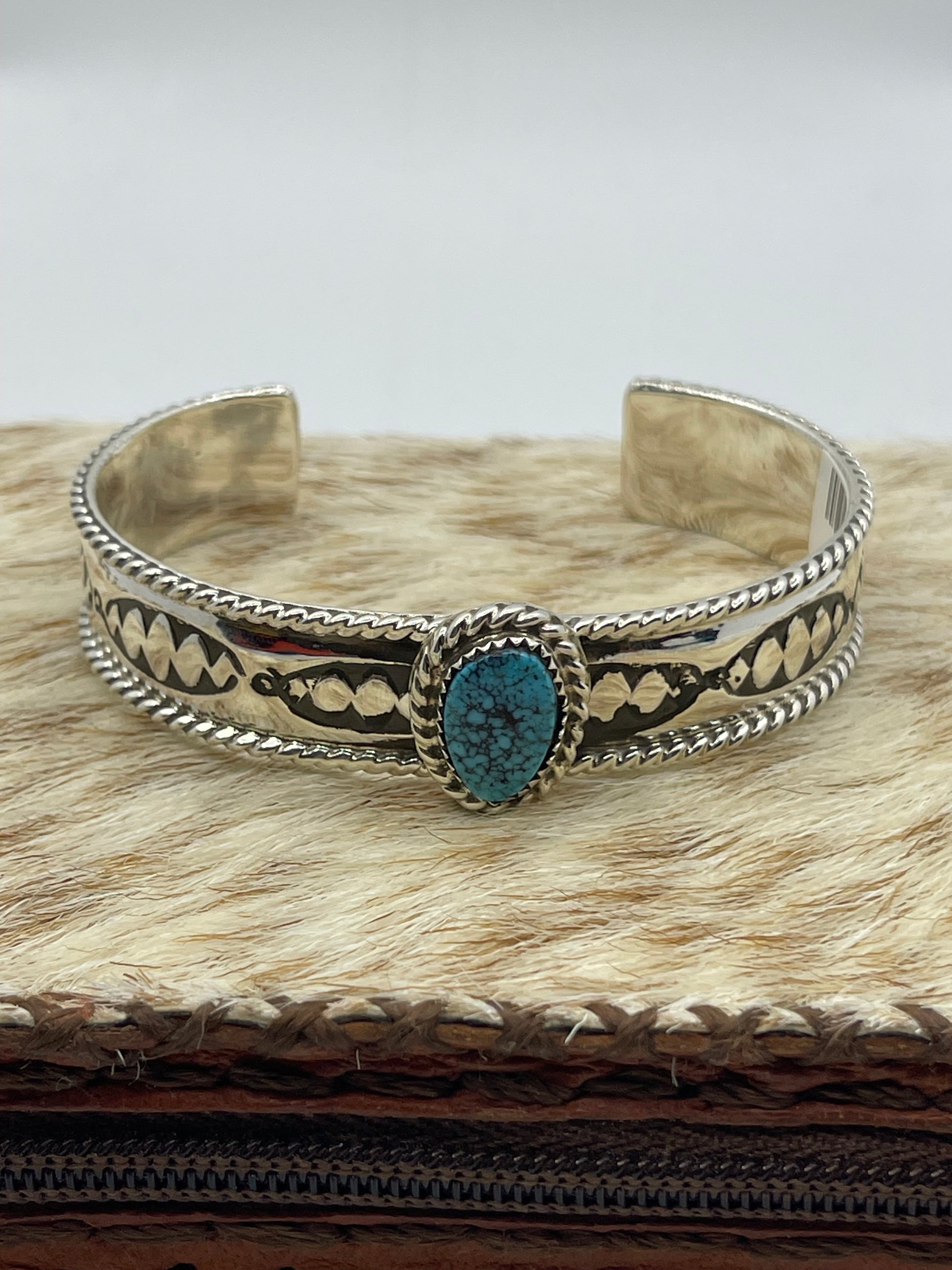 This exquisite Navajo cuff by Jason Bahe features high-grade Kingman web turquoise, showcasing vibrant blue hues with intricate natural veining. Adjustable from 6 1/4" to 7 1/2", it offers a perfect fit while adding a bold, authentic touch to your style. Crafted with expert artistry, this piece blends tradition and elegance, making it a standout accessory for any collection.