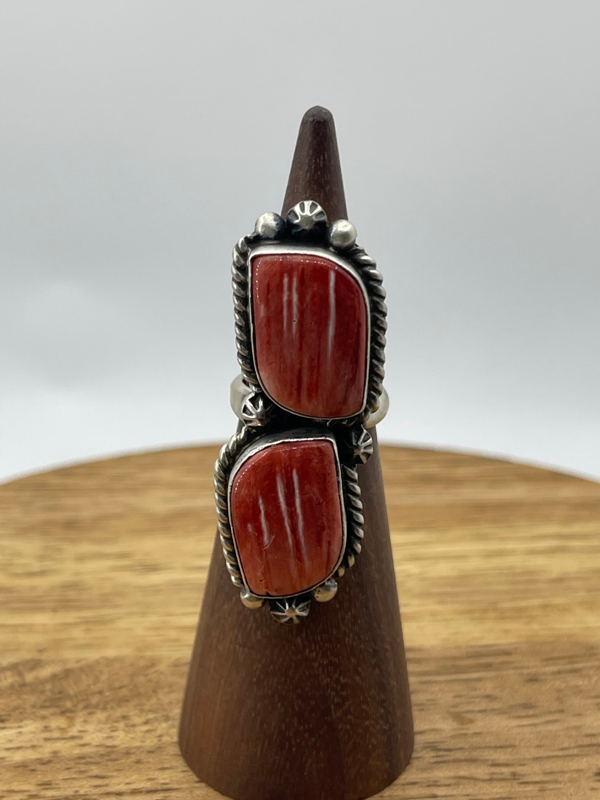 LOT 26 A 1/11 Adjustable 2 Stone Red Spiny Oyster Shell ring by Eugene Belone, Navajo