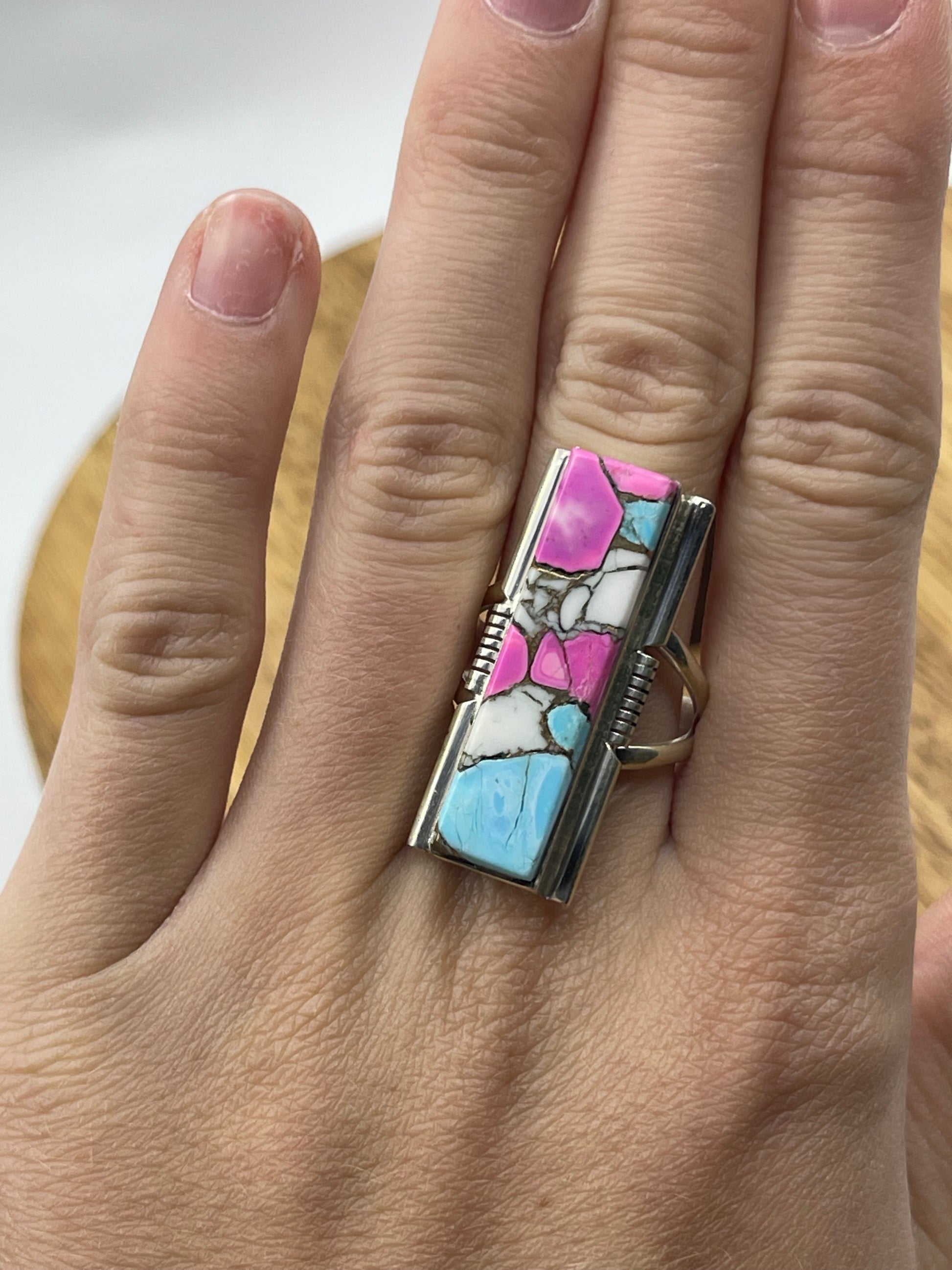 Experience the unique artistry of the 7.0 Cotton Candy Bar Ring by Navajo artist Steve Francisco. Crafted with precision, this ring blends traditional craftsmanship with a contemporary design, making it a standout accessory. Its vibrant colors and bold style add a distinctive touch to any outfit, showcasing both heritage and individuality. Perfect for those who appreciate authentic, handcrafted jewelry that tells a story.