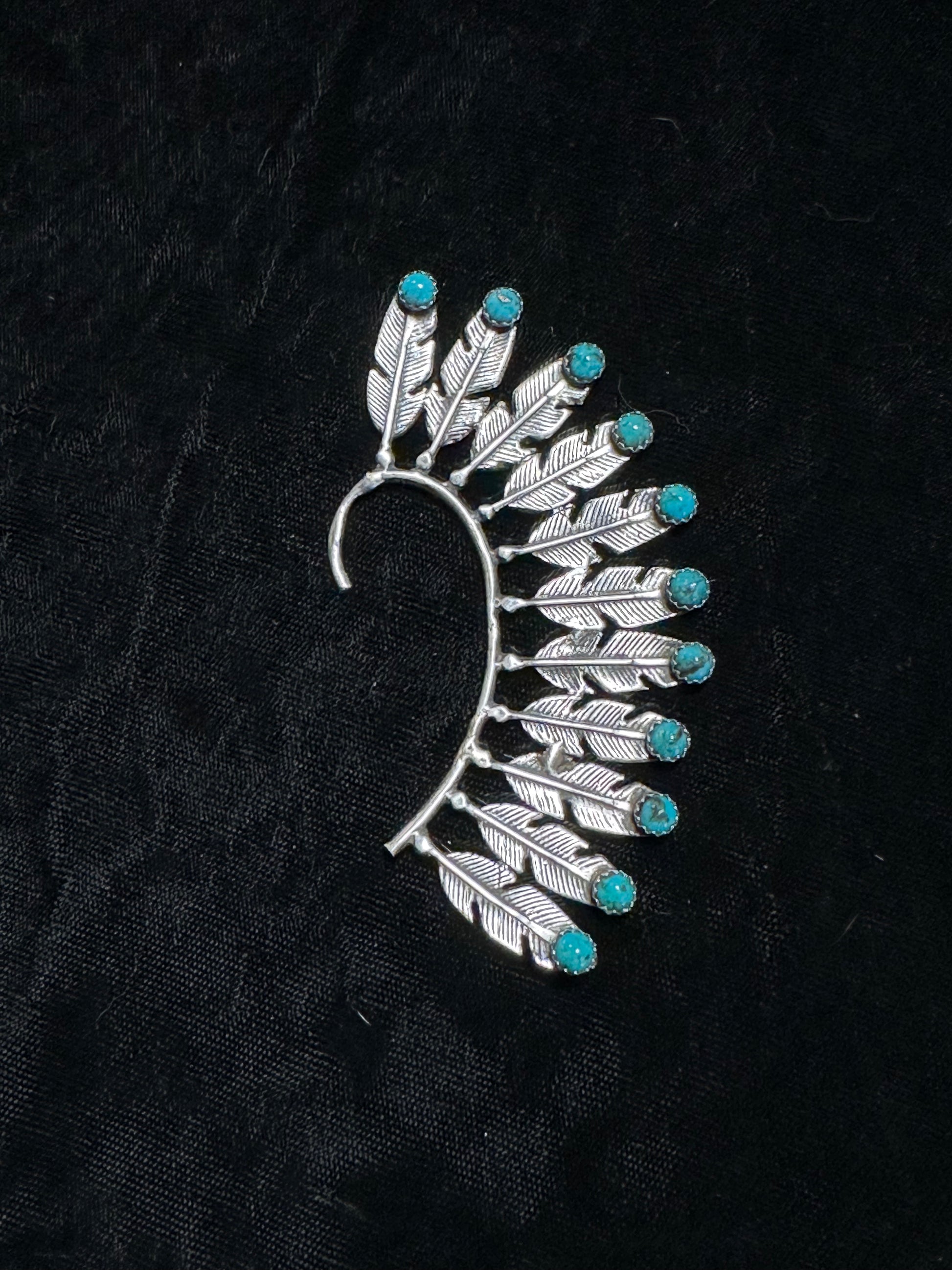 Transform your style with our Left Ear Headdress Cuff, handcrafted by Navajo artisans. This unique piece will add a touch of cultural flair and boldness to your look. Stand out from the crowd and support indigenous communities with this one-of-a-kind accessory. Matrix of turquoise may vary.