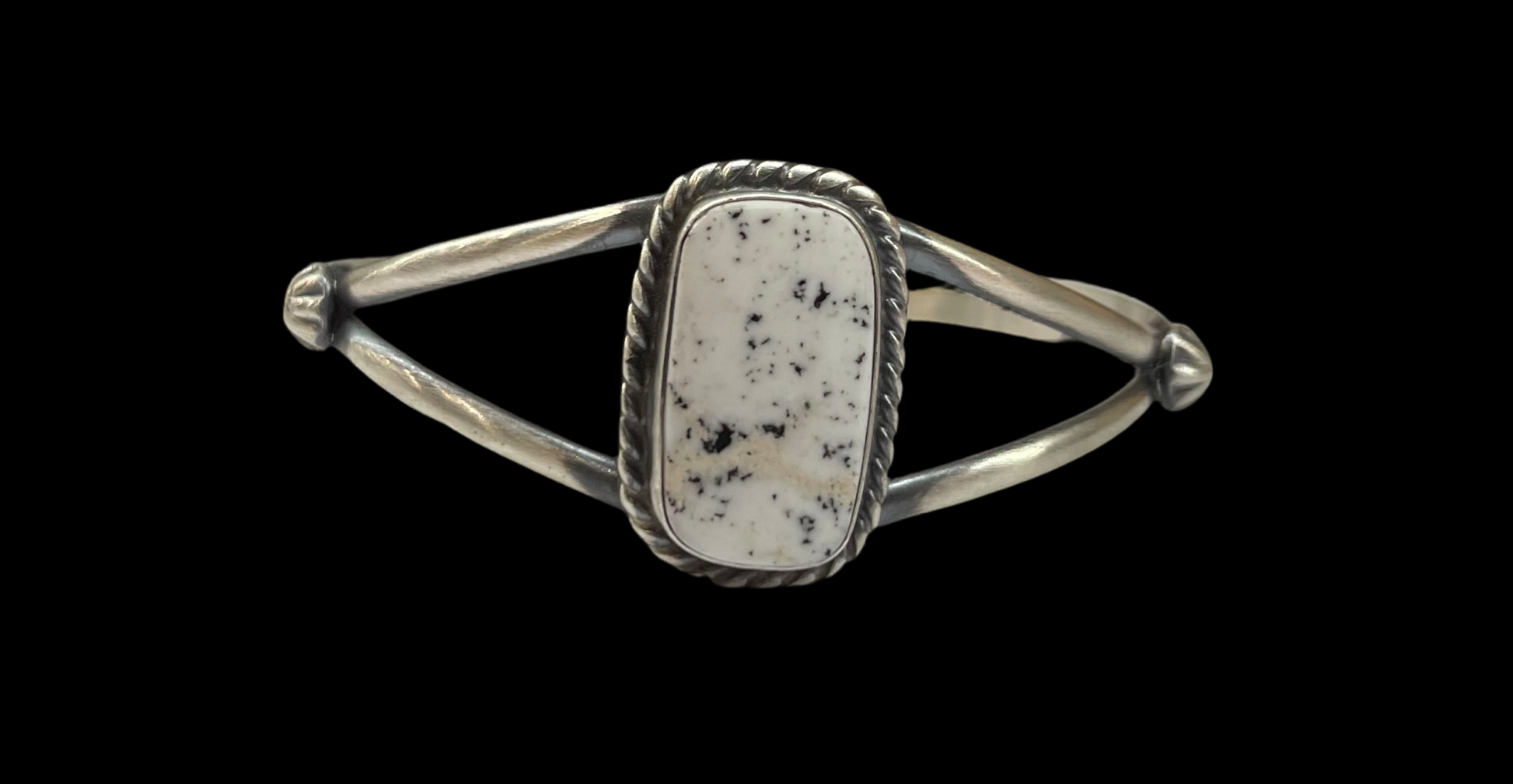 Adjustable cuff (6"-7") with a White Buffalo center stone. Crafted from bright sterling silver by Navajo artisan Augustine Largo.