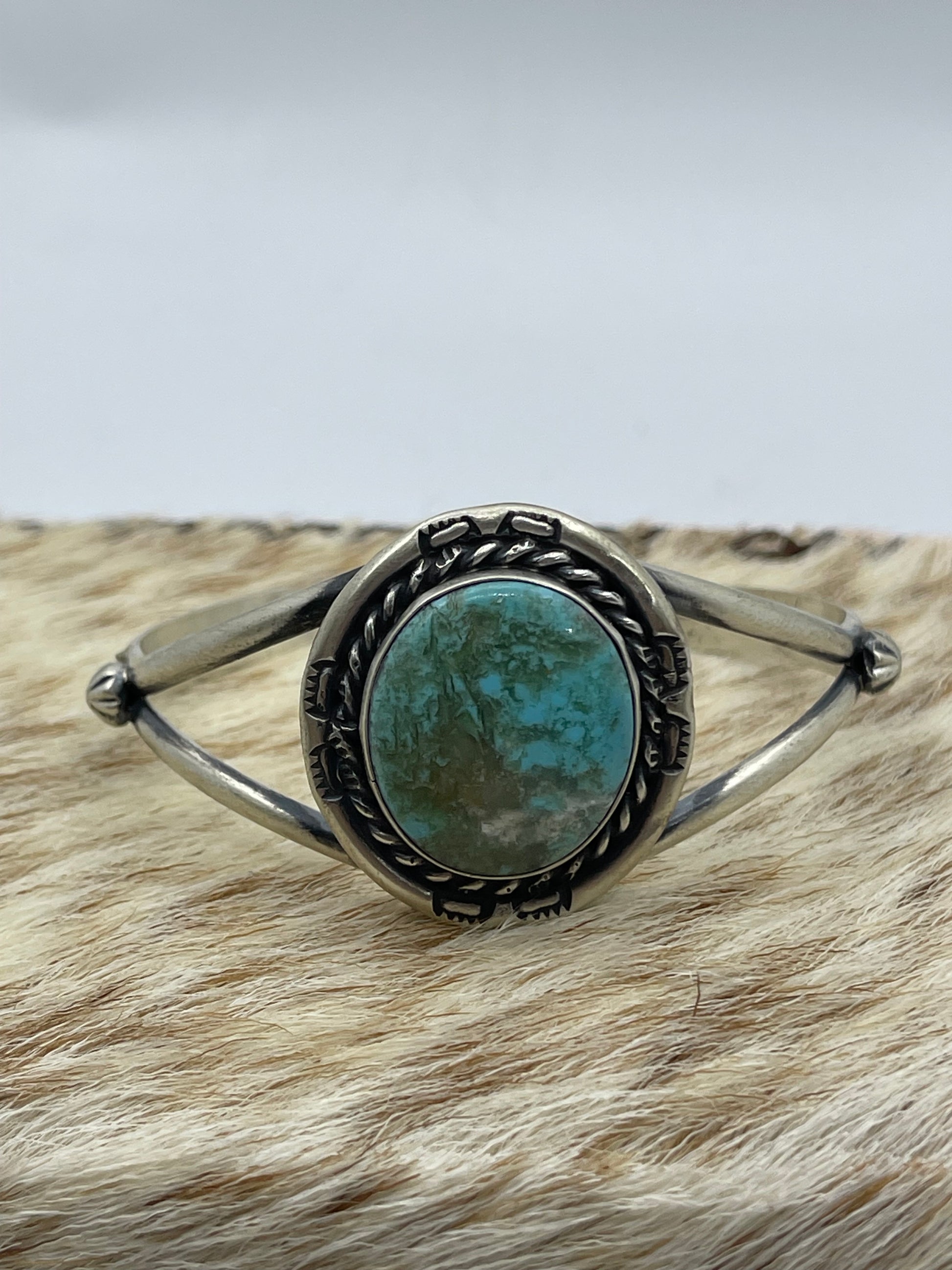This stunning Navajo cuff by Augustine Largo features genuine Kingman turquoise, renowned for its vibrant blue-green hues. Adjustable between 5 3/4" and 7 1/4", it offers a comfortable fit tailored to you. Handcrafted with traditional artistry, this piece not only elevates your style but also carries the rich heritage of Native American craftsmanship. Make a bold statement with a timeless accessory that blends beauty and cultural significance.