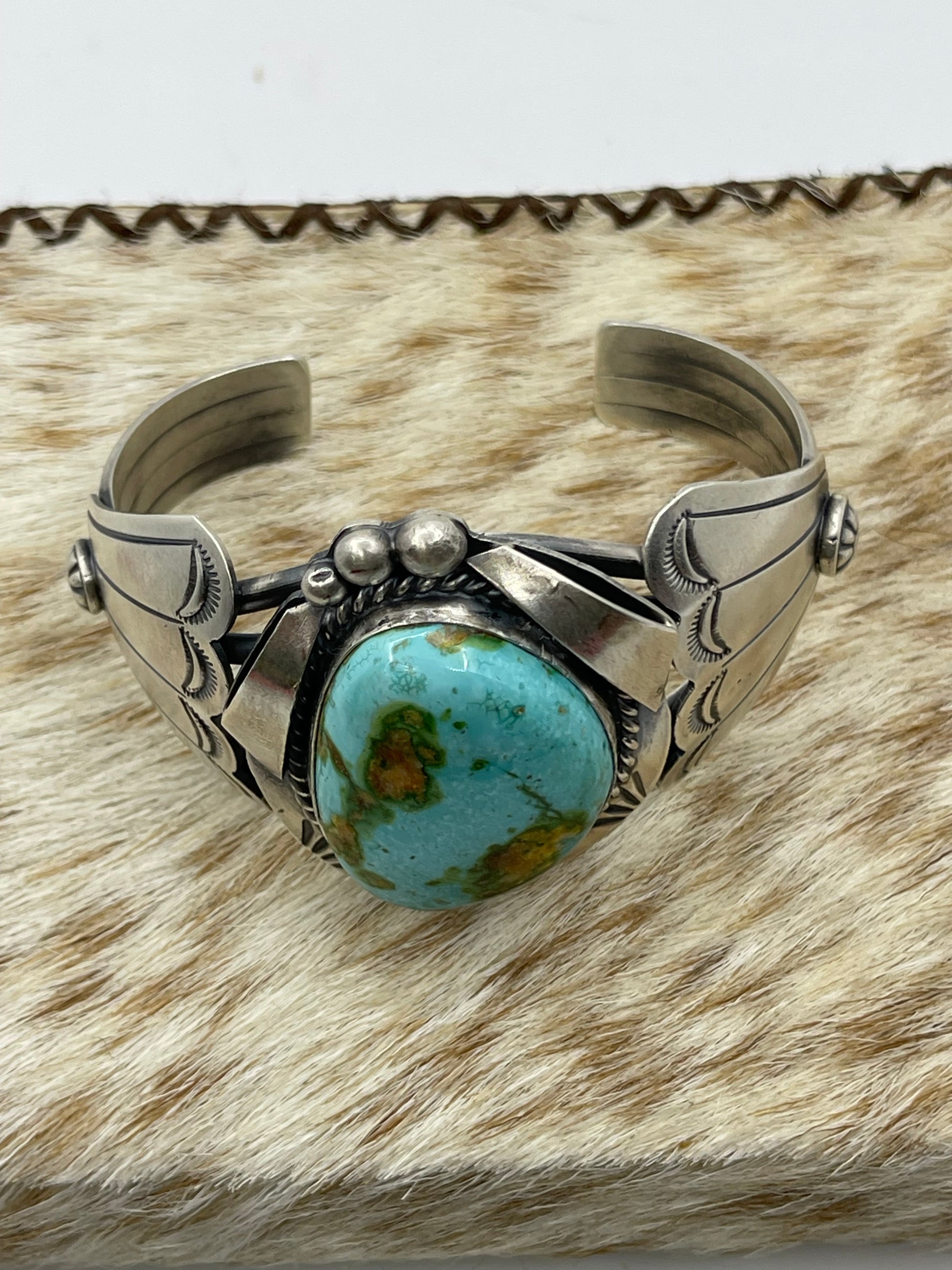 Experience the timeless beauty of Navajo craftsmanship with this 5 3/4" to 7" adjustable Sonoran Gold Turquoise and Silver Cuff by Delbert Secatero. Featuring vibrant Sonoran Gold Turquoise set in expertly crafted silver, this cuff offers both elegance and cultural heritage. Its adjustable size ensures a comfortable fit, making it a striking accessory that enhances any outfit with authentic Southwestern charm.