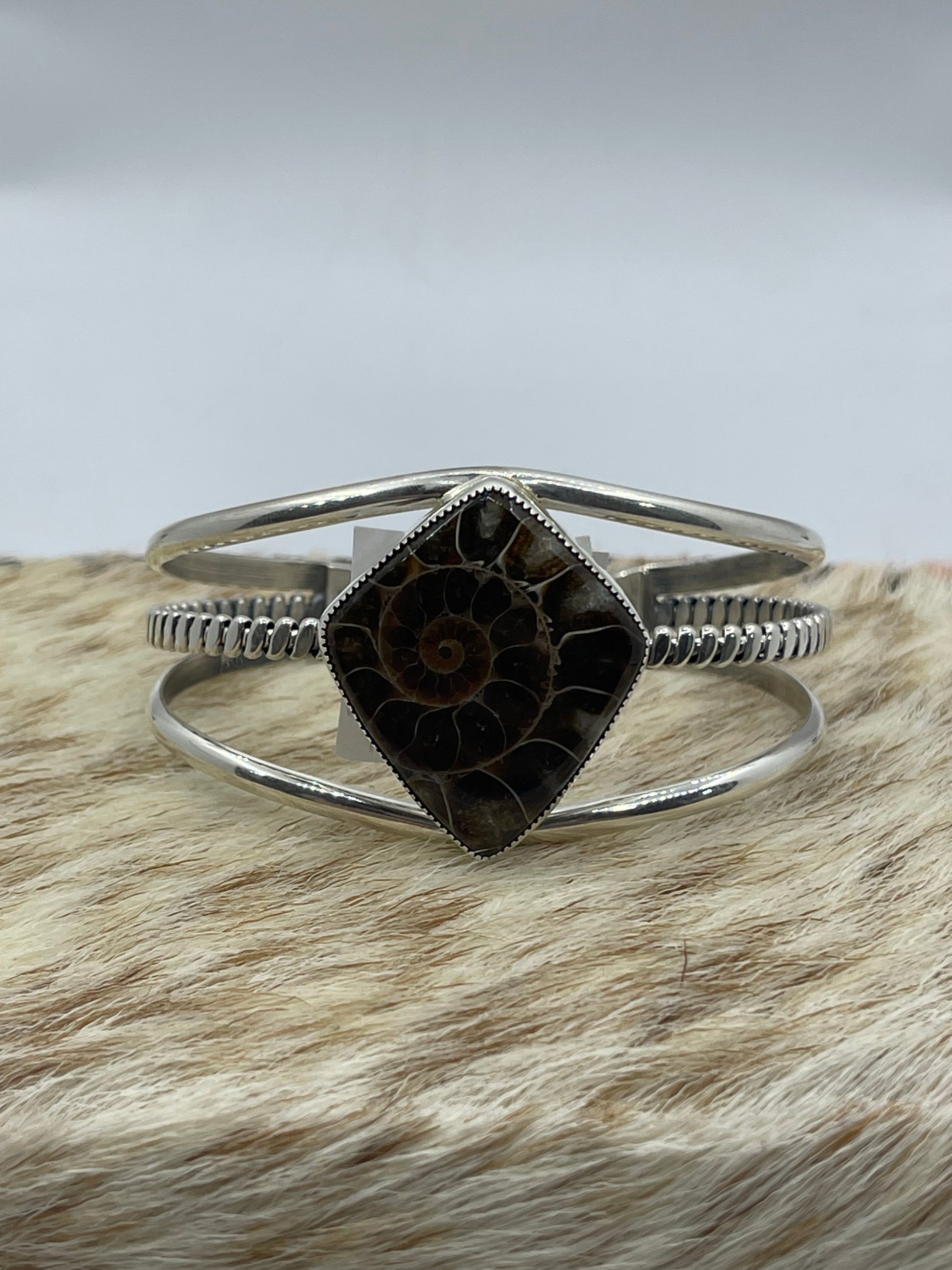 This stunning 5 1/2"-7" Ammonite Fossil Cuff by Navajo artist Dvane Smith combines natural history with exquisite craftsmanship. The genuine ammonite fossil centerpiece adds timeless beauty and a unique touch to your accessory collection. Adjustable to fit comfortably, this cuff not only complements any outfit but also carries a story of ancient origins, making it a captivating and meaningful piece to treasure.
