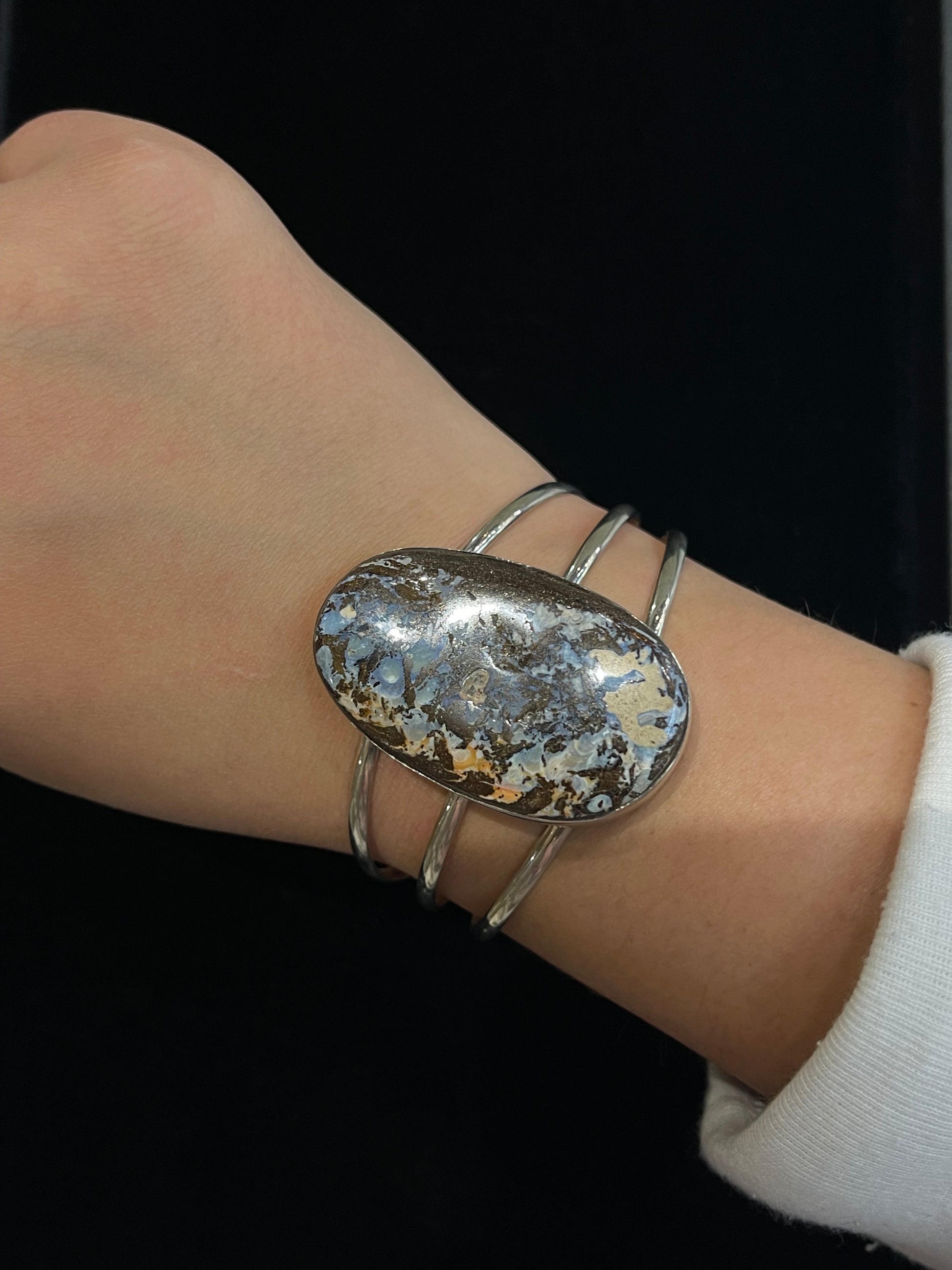 Add some unique flair to your jewelry collection with this 6"- 7 1/4" Natural Boulder Opal Cuff by V. Nez, Navajo. Made with sterling silver, this cuff is a stylish and playful statement piece that will add a touch of whimsy to any outfit.
