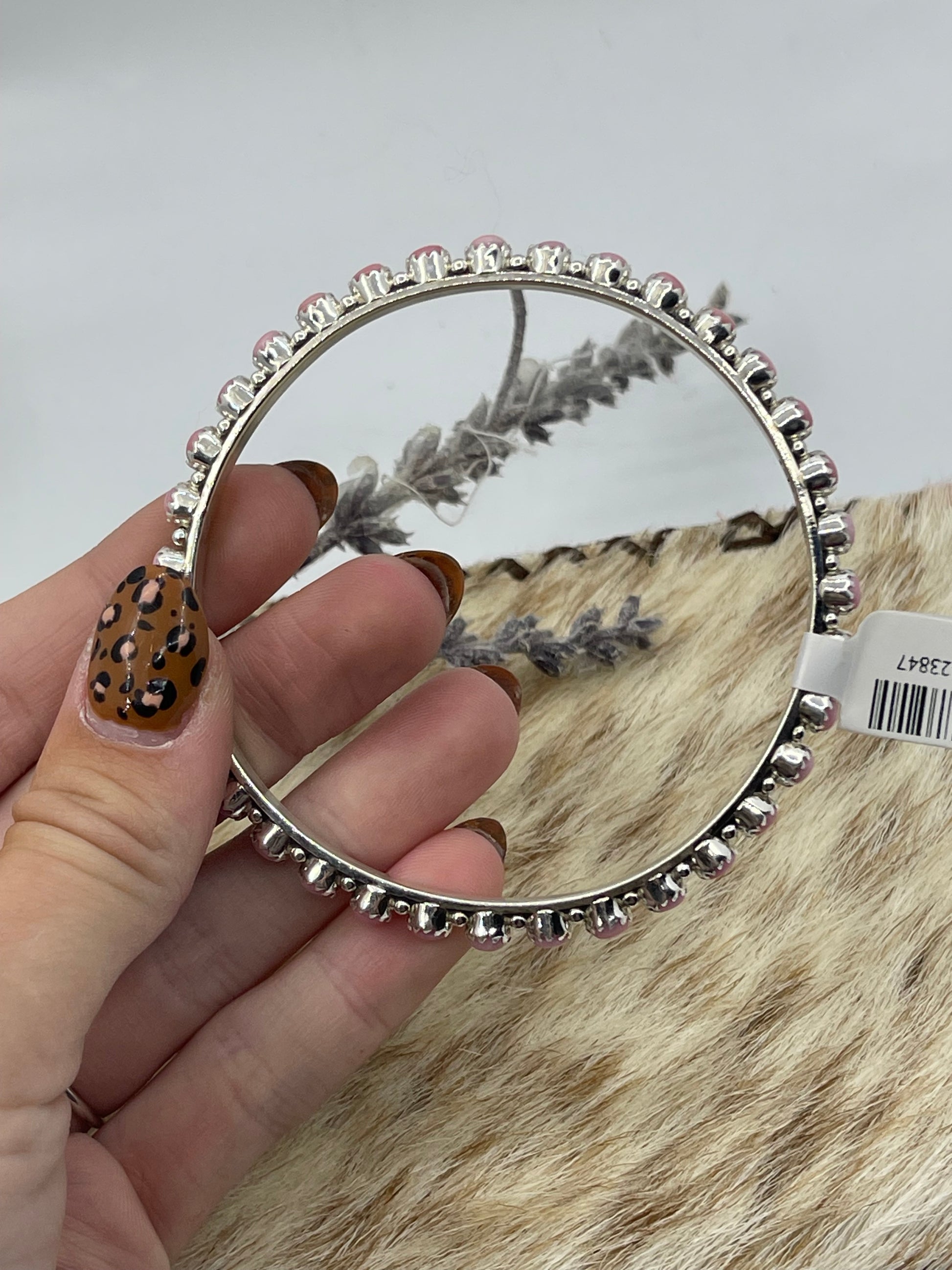 Elevate your style with this exquisite 7 3/4" Pink Conch Shell Bangle by renowned Navajo artist Gaynell Parker. Crafted with natural pink conch shell, this bangle offers a unique blend of vibrant color and cultural artistry. Its perfect size ensures comfortable wear while making a bold statement. Add a touch of authentic Southwestern elegance to any outfit with this stunning handcrafted piece.