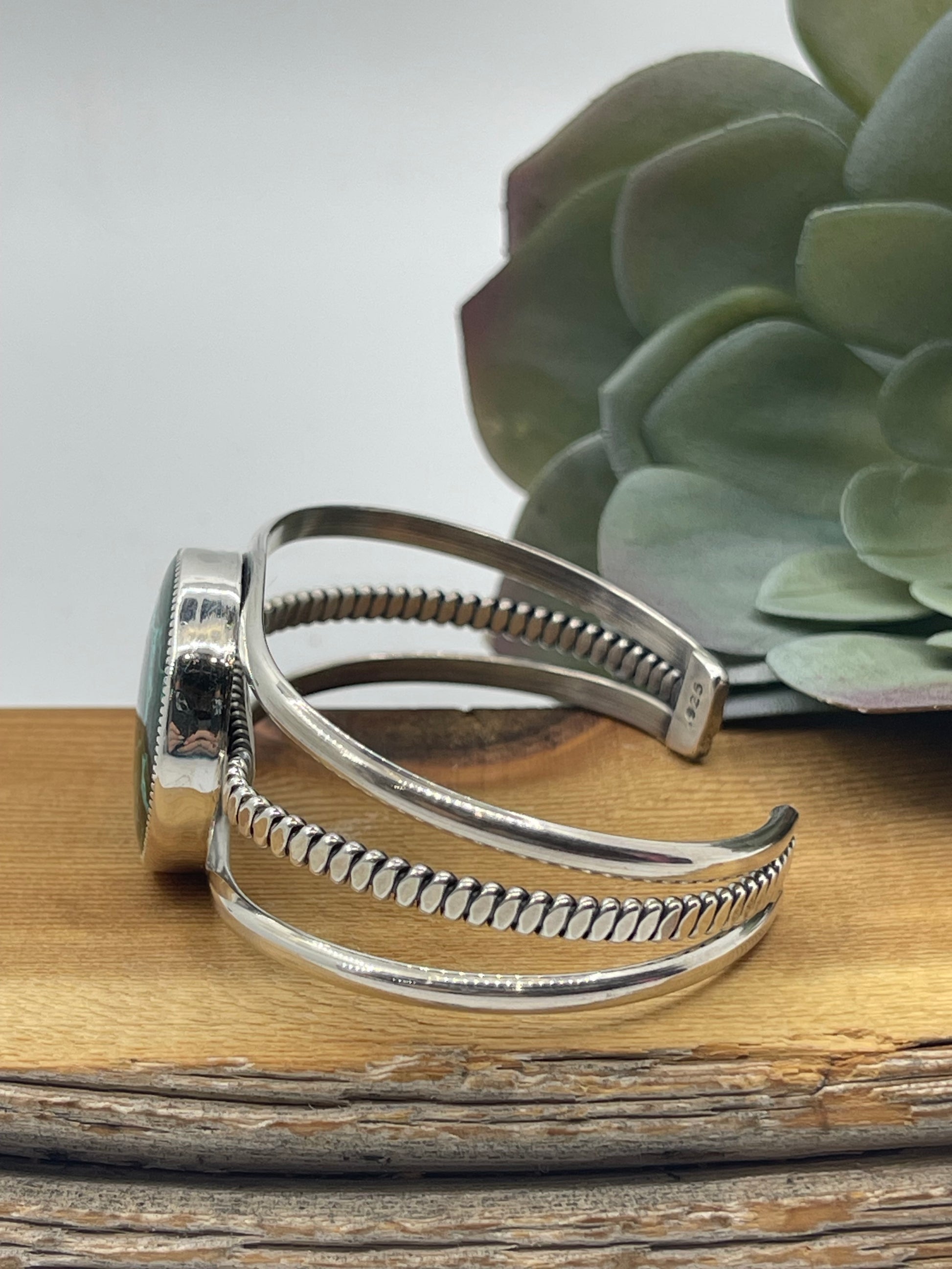 This stunning Chrysocolla Malachite Circle Cuff by Navajo artist Dvane Smith blends vibrant turquoise and rich green hues, making it a captivating statement piece. Adjustable from 5 1/4" to 7", it ensures a comfortable fit, allowing you to wear a unique piece of Native American craftsmanship that complements any outfit with bold, natural elegance.