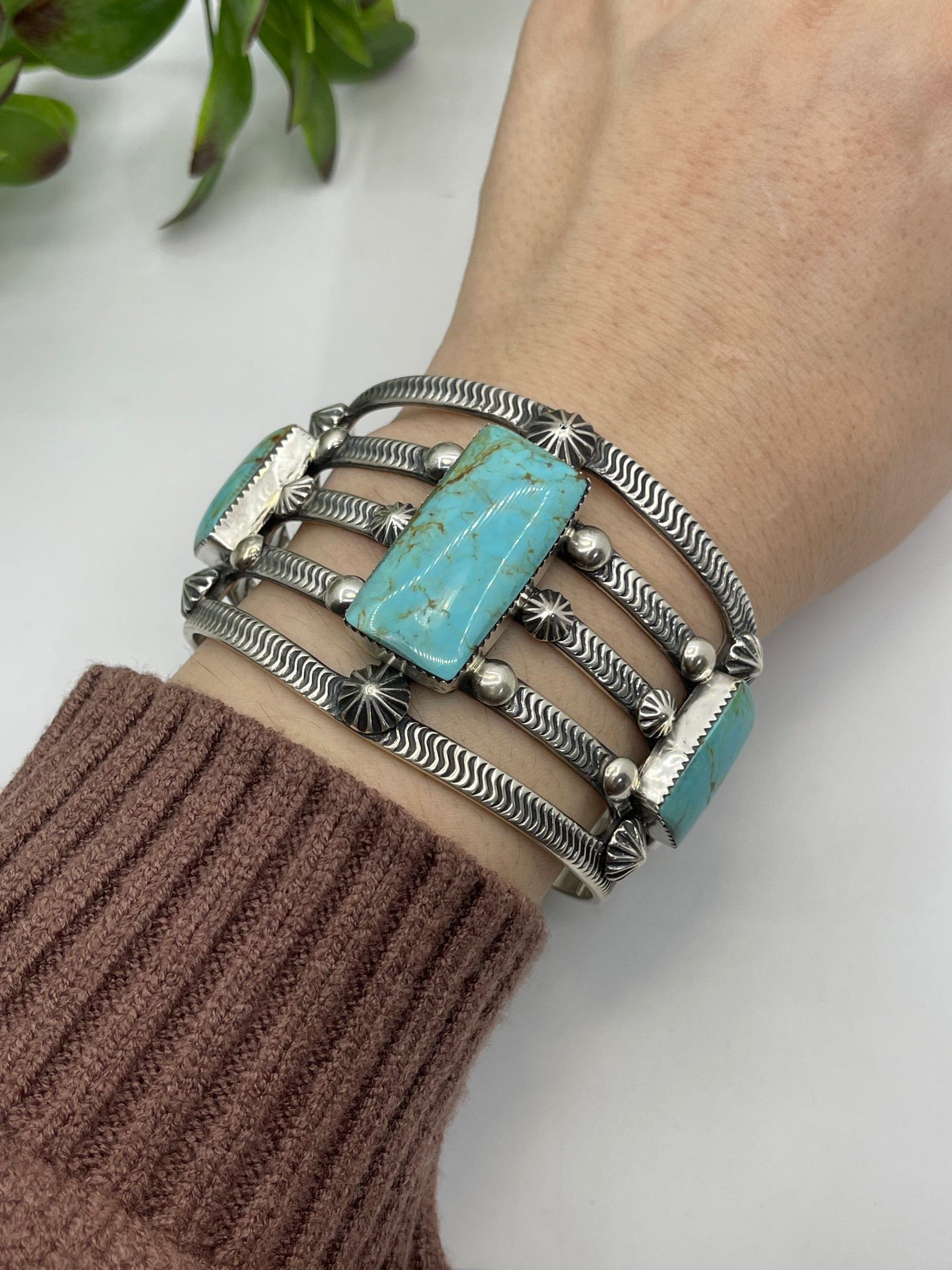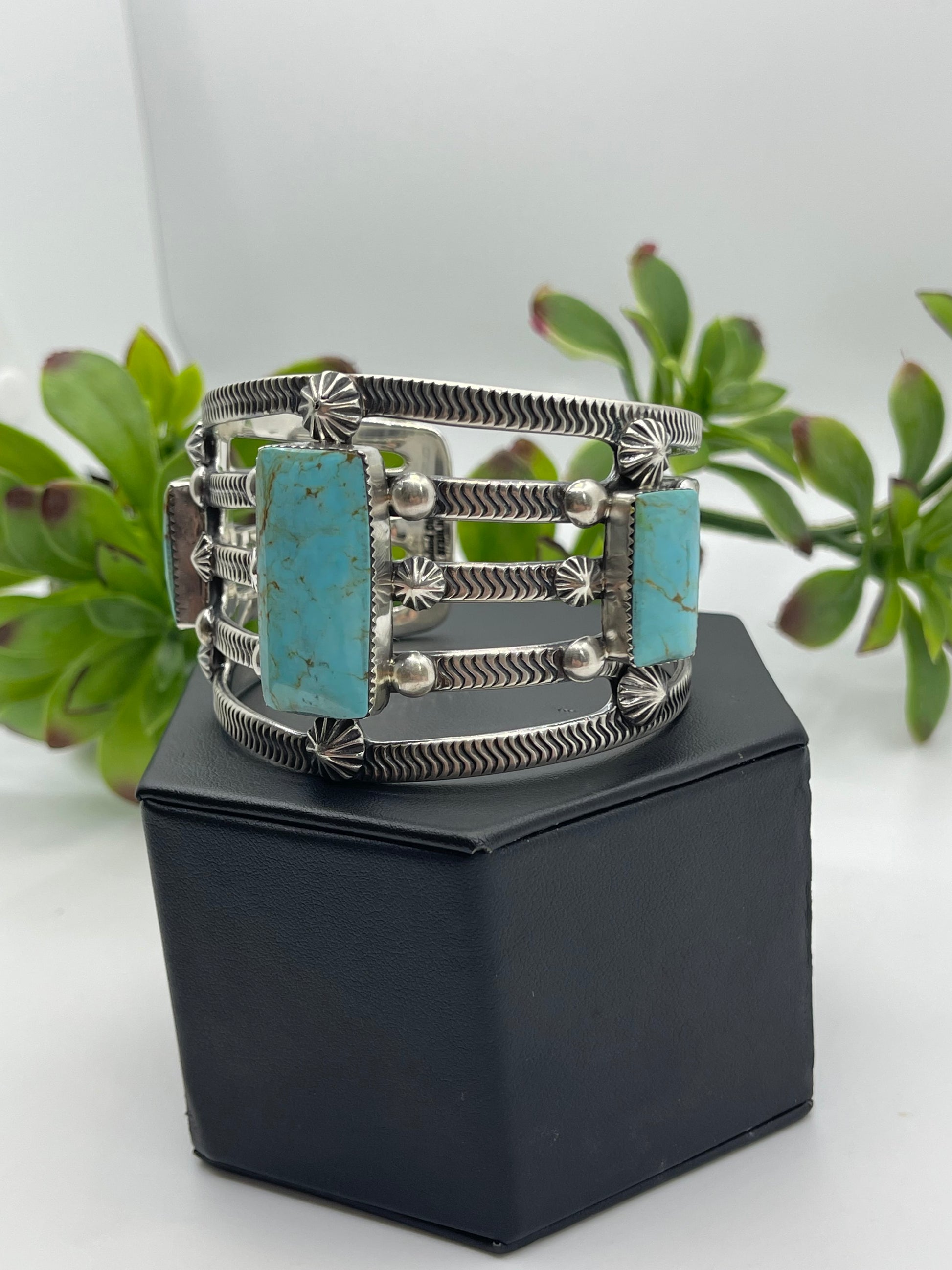 Handcrafted by renowned Navajo artisan Roland Dixon, this striking sterling silver cuff features three luminous rectangle shaped turquoise stones set in an intricate five-wire design. The 7.5" wrist size offers a comfortable fit while the bold geometric wirework showcases traditional Navajo craftsmanship at its finest. Each piece is a wearable work of art—authentic, timeless, and built to become a cherished heirloom. Perfect for collectors and those seeking genuine Native American jewelry with heritage and soul.